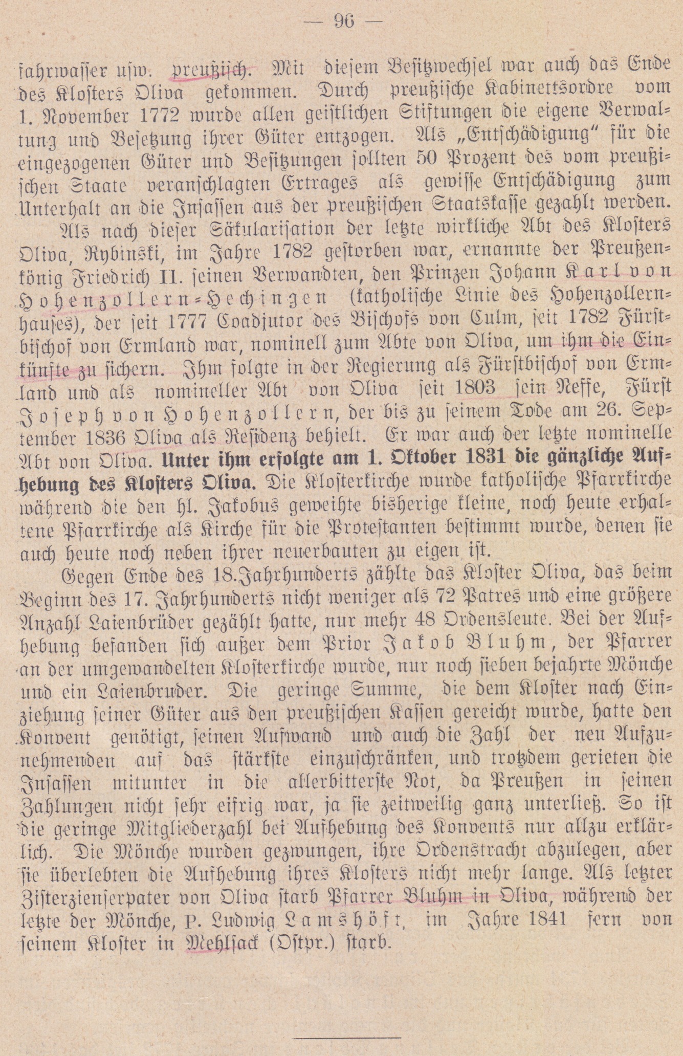 Als nach dieser Säkularisation der lebte wirkliche Abt des Klosters Oliva, Rybinski, im Jahre 1782 gestorben war, ernannte der Preußenfönig Friedrich II. seinen Verwandten, den Prinzen Johann farl von Hohenzollern - Hech ingen (fatholische Linie des Hohenzollernhaujes), der seit 1777 Coadjutor des Bischofs von Culm, jeit 1782 Fürstbischof von Ermland war, nominell zum Abte von Oliva, um ihm die Einfünfte zu sichern. Ihm folgte in der Regierung als Fürstbischof von Ermland und als nomineller Abt von Oliva seit 1803 sein Neffe, Fürst Joseph von Hohenzollern, der bis zu seinem Tode am 26. September 1836 Oliva als Residenz behielt. Er war auch der lekte nominelle Abt von Oliva. Unter ihm erfolgte am 1. Oktober 1831 die gänzliche Aufhebung des Klosters Oliva. Die Klosterkirche wurde katholische Pfarrkirche während die den hl. Jakobus geweihte bisherige kleine, noch heute erhaltene Pfarrkirche als Kirche für die Protestanten bestimmt wurde, denen sie auch heute noch neben ihrer ncuerbauten zu eigen ist.