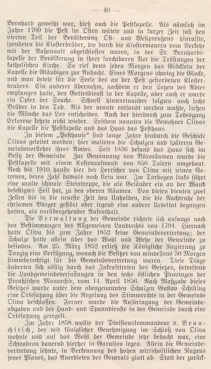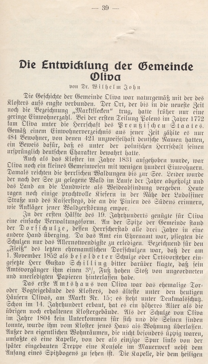 Die Geschichte der Gemeinde Oliva war naturgemäß mit der des Klosters aufs engste verbunden. Der Ort, der bis in die neueste Zeit noch die Bezeichnung „Marktflecken“ trug, hatte früher nur eine geringe Einwohnerzahl. Bei der ersten Teilung Polens im Jahre 1772 kam Oliva unter die Herrschaft des Preußisch eit Staates. Gemäß einem Einwohnerverzeichnis aus jener Zeit zähite es nur 484 Bewohner, von denen 421 unzweifelhaft deutsche Namen hatten, ein Beweis dafür, daß es unter der polnischen Herrsciait seinen ursprünglich deutschen Charakter bewahrt hatte.