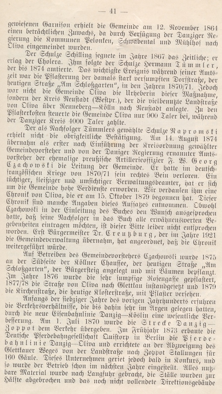 Der als Nachfolger Tümmlers gewählte Schulze Napromski erhielt nicht die obrigkeitliche Bestätigung. Am 14. August 1874 übernahm als erster nach Einführung der Kreisordnung gewählter Gemeindevorsteher und von der Daniger Niegierung ernannter Amtsvorsteher der ehemalige preußische Artillerieoffizier F. W. Georg Czachowski die Leitung der Gemeinde. Er hatte im deutsch - französischen Striege von 1870/71 sein rechtes Bein verloren. Ein tüchtiger, fleißiger und umsichtiger Verwaltungsbeamter, hat er sich um die Gemeinde hohe Verdienste erworben. Wir ver?anlen ihm eine Chronik von Oliva, die er am 15. Oktober 1879 begonnen hat. Dieser Chronik sind manche Angaben dieses Ausjabes entnomunen. Obwohl Czachowski in der Einleitung des Buches den Wunsch ausgesprochen hatte, daß seine Nachfolger in das Buch alle erwähnenswerten Begebenheiten eintragen möchten, ist dieser Bitte leider nicht entsprochen worden. Erst Bürgermeister Dr. Creußburg, der im Jahre 1921 die Gemeindeverwaltung übernahm, hat angeordnet, daß die Chronik weitergeführt würde.