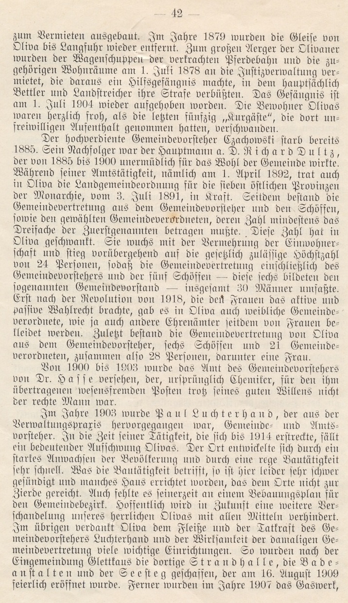 Der hochverdiente Gemeindevorsteher Czachowski starb bereits 1885. Sein Nachfolger war der Hauptmann a. D. Richard Dultz, der von 1885 bis 1900 unermüdlich für das Wohl der Gemeinde wirfte. Während seiner Amtstätigkeit, nämlich am 1. April 1892, trat auch in Oliva die Landgemeindeordnung für die sieben östlichen Provinzen der Monarchie, vom 3. Juli 1891, in Straft. Seitdem bestand die Gemeindevertretung aus dem Gemeindevorsteher und den Schöffen, sowie den gewählten Gemeindeverordneten, deren Zahl mindestens das Dreifache der Zuerstgenannten betragen mußte. Diese Zahl hat in Oliva geschwankt. Sie wuchs mit der Vermehrung der Einwohnerschaft und stieg vorübergehend auf die gesetzlich zulässige Höchstzahl von 24 Personen, sodaß die Gemeindevertretung einschließlich des Gemeindevorstehers und der fünf Schöffent --- diese sechs bildeten den sogenannten Gemeindevorstand – insgesamt 30 Männer umfaßte. Erst nach der Revolution von 1918, die deit Frauen das aftive und passive Wahlrecht brachte, gab es in Oliva auch weibliche Gemeindeverordnete, wie ja auch andere Ehrenämter seitdem von Frauen befleidet werden. Zuleßt bestand die Gemeindevertretung von Oliva aus dem Gemeindevorsteher, sechs Schöffen und 21 Gemeindeverordneten, zusammen also 28 Personen, darunter eine Frau.