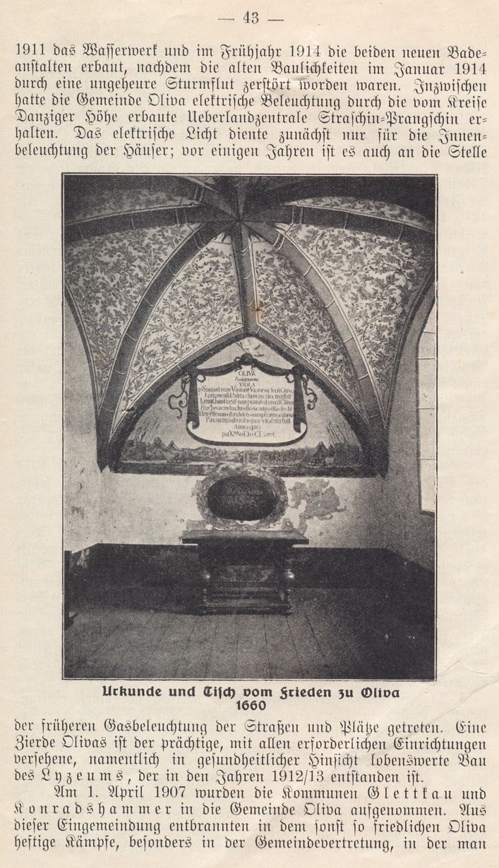 Am 1. April 1907 wurden die sommunen Glettkau und it Conradshammer in die Gemeinde Oliva aufgenommen. Aus dieser Eingemeindung entbrannten in dem sonst so friedlichen Oliva heftige Kämpfe, besonders in der Gemeindevertretung, in der man durch den Eingemeindungsvertrag den Bewohnern von Glettkau und Konradshammer für die mehrere Jahre dauernde Uebergangszeit eine unverhältnismäßig große Zahl von Gemeindeverordneten bewilligt hatte.