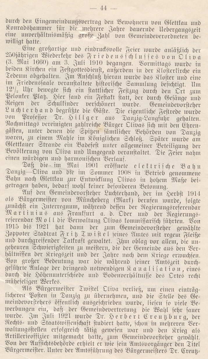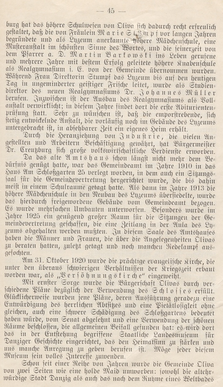 Als Bürgermeister Twistel Oliva verließ, um einen einträglicheren Posten in Danzig zu übernehmen, und die Stelle des Gemeindevorstehers öffentlich ausgeschrieben wurde, liefen so viele Bewerbungen ein, daß der Gemeindevertretung die Wahl sehr sauer wurde. Im Juli 1921 wurde Dr. Herbert Kreuzburg, der Rechts- und Staatswissenschaft studiert hatte, schon in mehreren Verwaltungsstellen erfolgreich tätig gewesen war und den Strieg als Artillerieoffizier mitgemacht hatte, zum Gemeindevorsteher gewählt. Von der Aufsichtsbehörde erhielt er wie sein Amtsvorgänger den Titel Bürgermeister. Unter der Amtsführung des Bürgermeisters Dr. Creußburg hat das höhere Schulwesen von Oliva sich dadurch recht erfreulich gestaltet, daß die von Fräulein Marie Stumpf vor langen Jahren begründete und als Lyzeum anerkannte höhere Mädchenschule, eine Musteranstalt im schönsten Sinne des Wortes, und die seinerzeit von dem Pfarrer a. D. Martin Barkowski ins Lebeit gerufene und mehrere Jahre mit bestem Erfolg geleitete höhere Sinabenschule als Realgymnasium i. E. von der Gemeinde übernommen wurden. Während Frau Direktorin Stumpf das Lyzeum bis auf den heutigen Tag in ungeminderter geistiger Frische leitet, wurde als Studiendirektor des neuen Realgymnasiums Dr. johannes Müller berufen. Jnzwischen ist der Ausbau des Kealgymnasiums als Vollanstalt verwirklicht; in diesem Jahre findet dort die erste Abituriententprüfung statt. Sehr zu wünschen ist, daß die emporstrebende, sich stetig entwickelnde Anstalt, die vorläufig noch im Gebäude des Lyzeums untergebracht ist, in absehbarer Zeit ein eigenes Heim erhält.