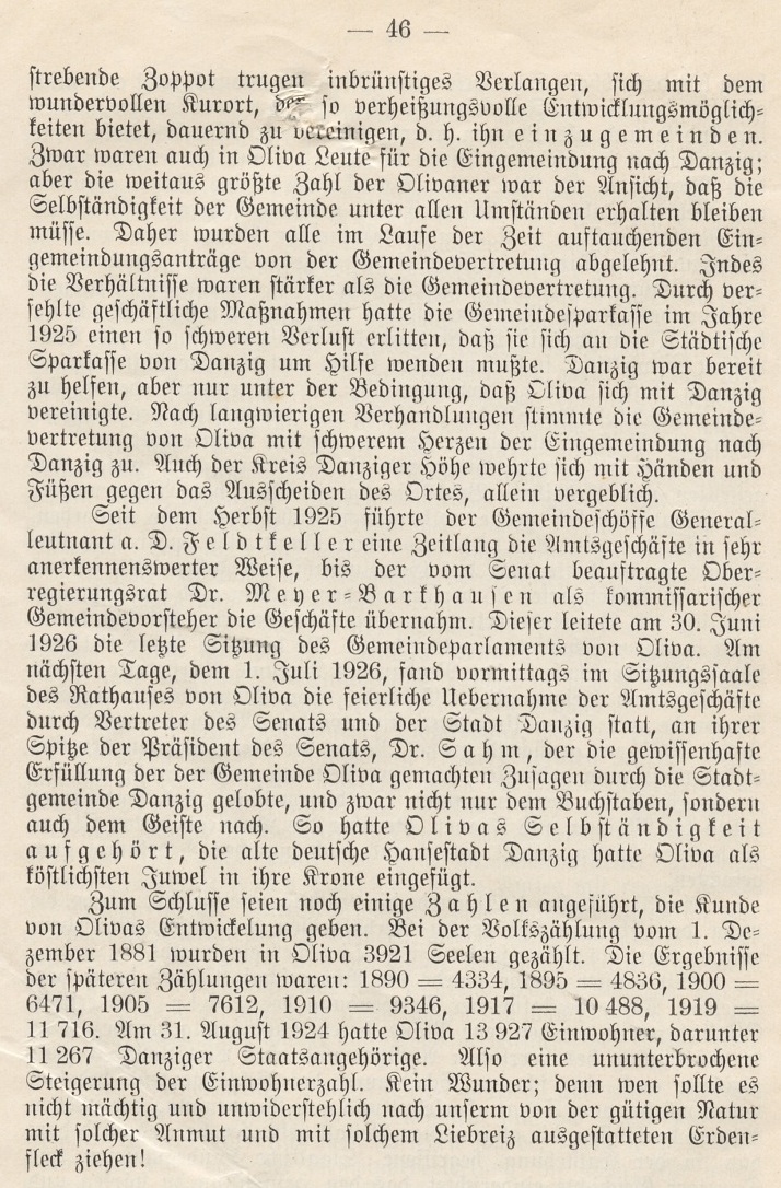 Seit dem Herbst 1925 führte der Gemeindeschöffe Generalleutnant a. D. Feldtkeller eine Zeitlang die Amtsgeschäfte in sehr anerkennenswerter Weise, bis der vom Senat beauftragte Oberregierungsrat Dr. Meyer - Barkhausen als kommissarischer Gemeindevorsteher die Geschäfte übernahm. Dieser leitete am 30. Juni 1926 die lebte Sizung des Gemeindeparlaments von Oliva. Am nächsten Tage, dem 1. Juli 1926, fand vormittags im Sißungsjaale des Rathauses von Oliva die feierliche Uebernahme der Amtsgeschäfte durch Vertreter des Senats und der Stadt Danzig statt, an ihrer Spiße der Präsident des Senats, Dr. Sahm, der die gewissenhafte Erfüllung der der Gemeinde Oliva gemachten Zusagen durch die Stadtgemeinde Danzig gelobte, und zwar nicht nur dem Buchstaben, sondern auch dem Geiste nach. So hatte Olivas Selbst ändigkeit aufgehört, die alte deutsche Hansestadt Danzig hatte Oliva als köstlichsten Juwel in ihre Krone eingefügt.