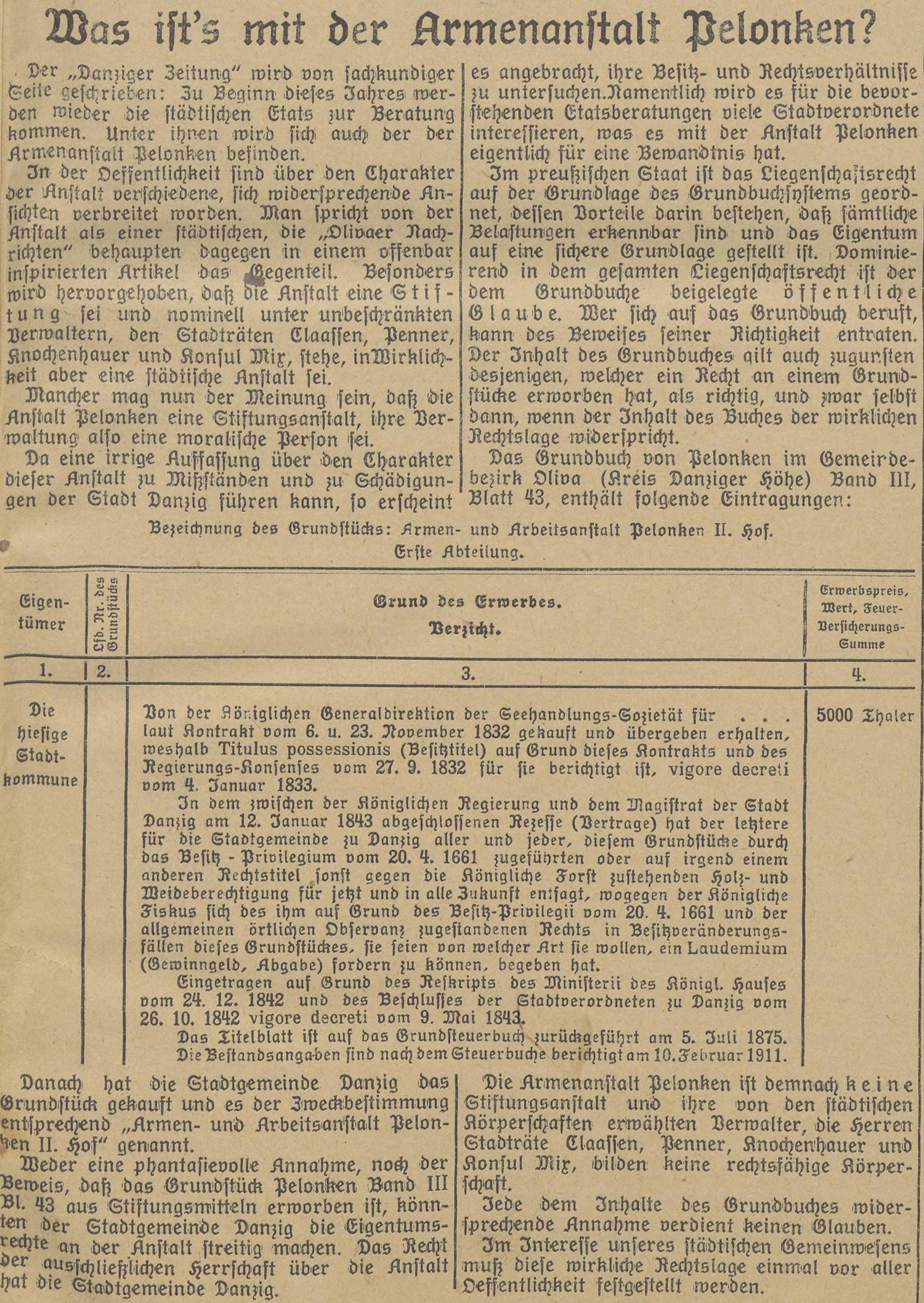 Da eine irrige Auffassung über den Charakter dieser Anstalt zu Mifständen und zu Schädigungen der Stadt Danzig führen kann, so erscheint es angebracht, ihre Besitz- und Rechtsverhältniffe zu untersuchen Namentlich wird es für die bevorstehenden Etatsberatungen viele Gtadtverordnete intereffieren, was es mit der Anstalt Pelonken eigentlich für eine Bemandtnis hat.