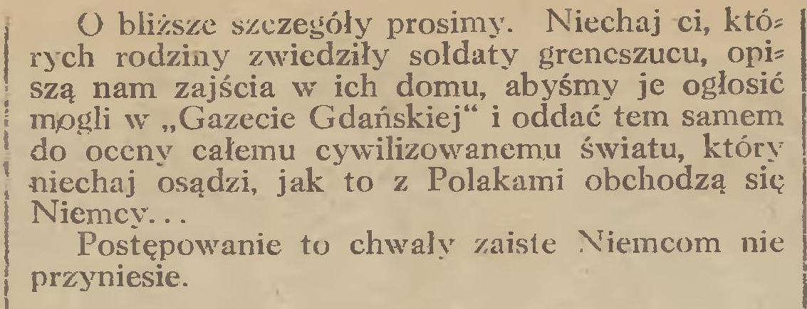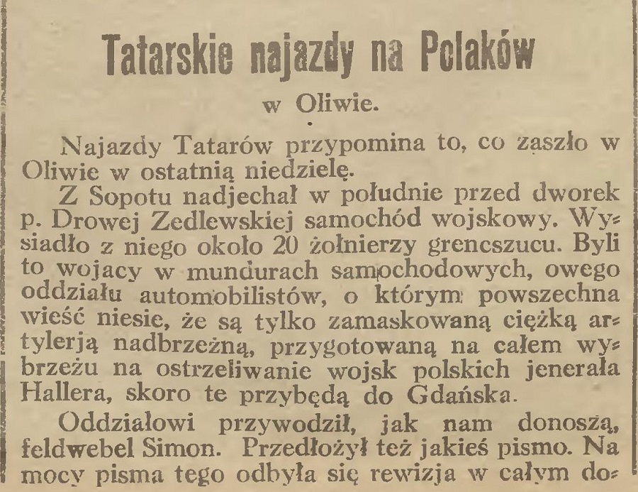 Z Sopotu nadjechał w południe przed dworek p. Drowej Zedlewskiej samochód wojskowy. Wysiadło z niego około 20 żołnierzy grencszucu. Byli to wojacy w mundurach samochodowych, owego oddziału automobilistów, o którym powszechna wieść niesie, że są tylko zamaskowaną ciężką artylerją nadbrzeżną, przygotowaną na całem wybrzeżu na ostrzeliwanie wojsk polskich jenerała Hallera, skoro te przybędą do Gdańska.