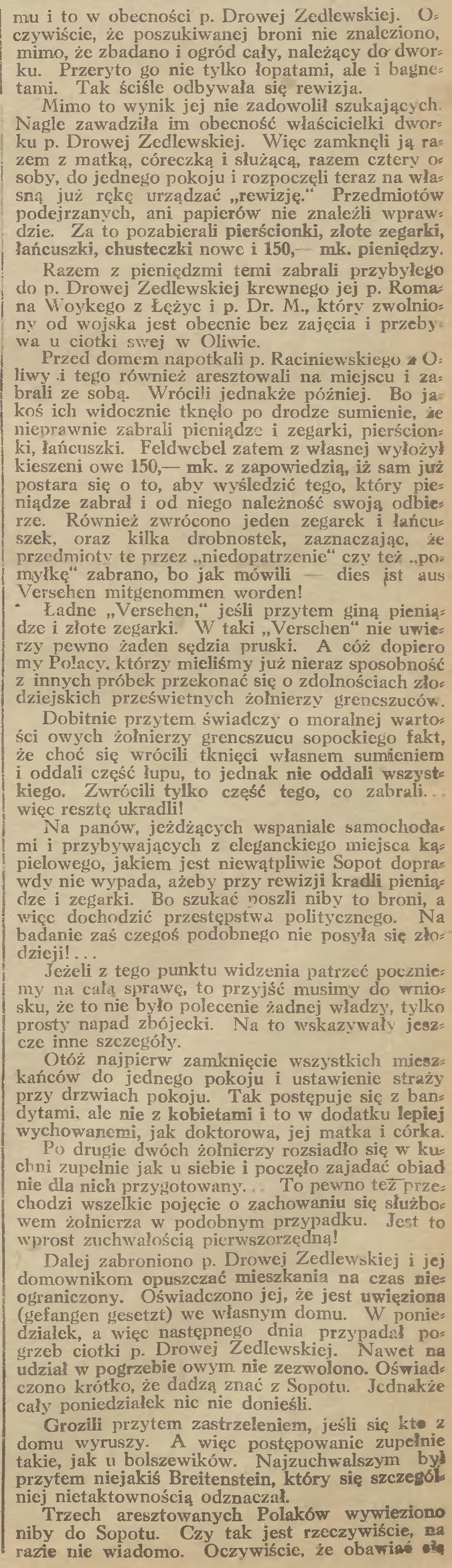 Dalej zabroniono p. Drowej Zedlewskiej i jej domownikom opuszczać mieszkania na czas nieograniczony. Oświadczono jej, że jest uwięziona (gefangen gesetzt) we własnym domu. W poniedziałek, a więc następnego dnia przypadał pogrzeb ciotki p. Drowej Zedlewskiej. Nawet na udział w pogrzebie owym, nie zezwolono. Oświadczono krótko, że dadzą znać z Sopotu. Jednakże cały poniedziałek nic nie donieśli.