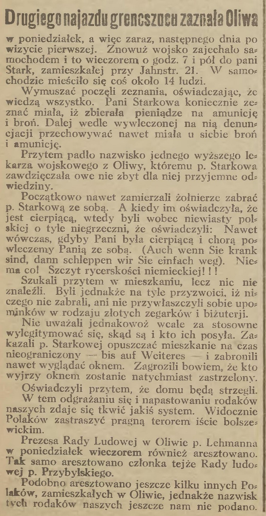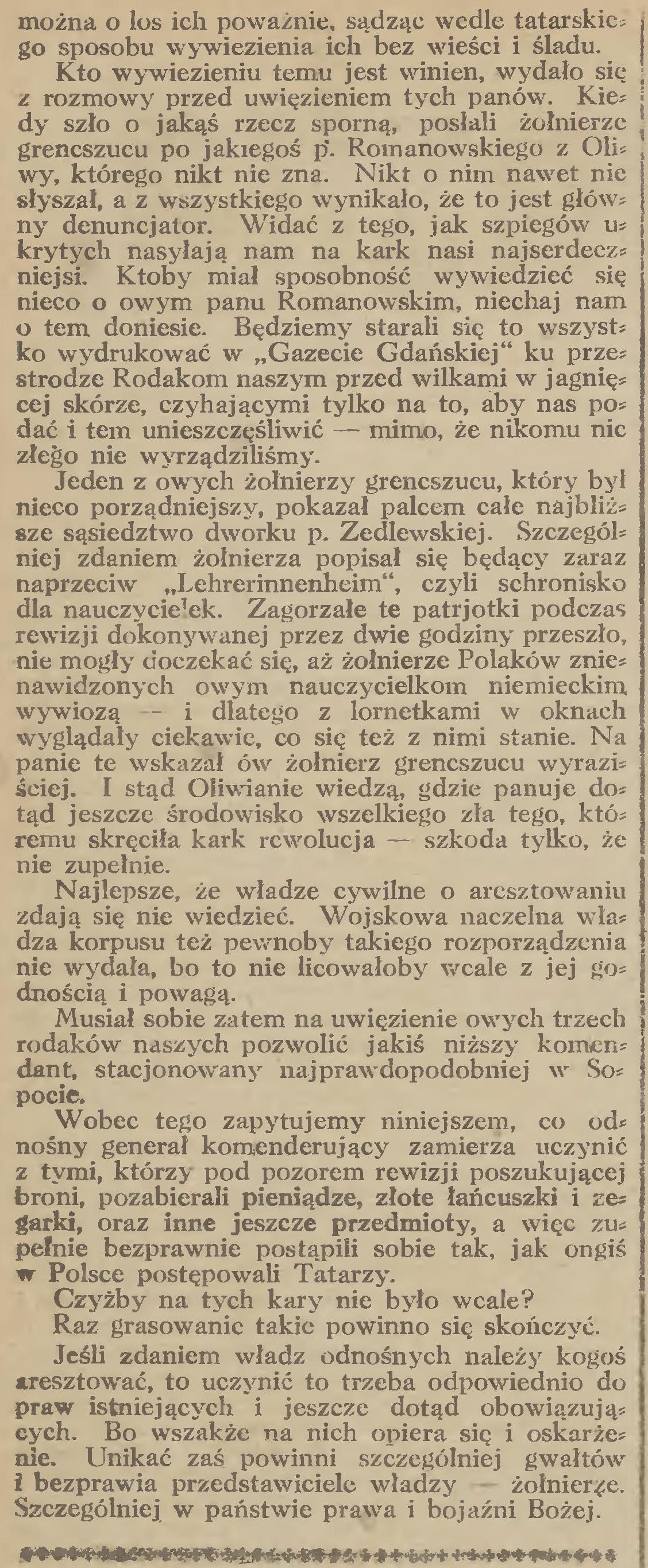 Jeden z owych żołnierzy grencszucu, który był nieco porządniejszy, pokazał palcem cale najbliższe sąsiedztwo dworku p. Zedlewskiej. Szczególniej zdaniem żołnierza popisał się będący zaraz naprzeciw „Lehrerinnenheim”, czyli schronisko dla nauczycielek. Zagorzałe te patrjotki podczas rewizji dokonywanej przez dwie godziny przeszło, nie mogły doczekać się, aż żołnierze Polaków znienawidzonych owym nauczycielkom niemieckim wywiozą i dlatego z lornetkami w oknach wyglądały ciekawie, co się też z nimi stanie. Na panie te wskazał ów żołnierz grencszucu wyraziściej. I stąd Oliwianie wiedzą, gdzie panuje dotąd jeszcze środowisko wszelkiego zła tego, któremu skręciła kark rewolucja szkoda tylko, że nie zupełnie.
