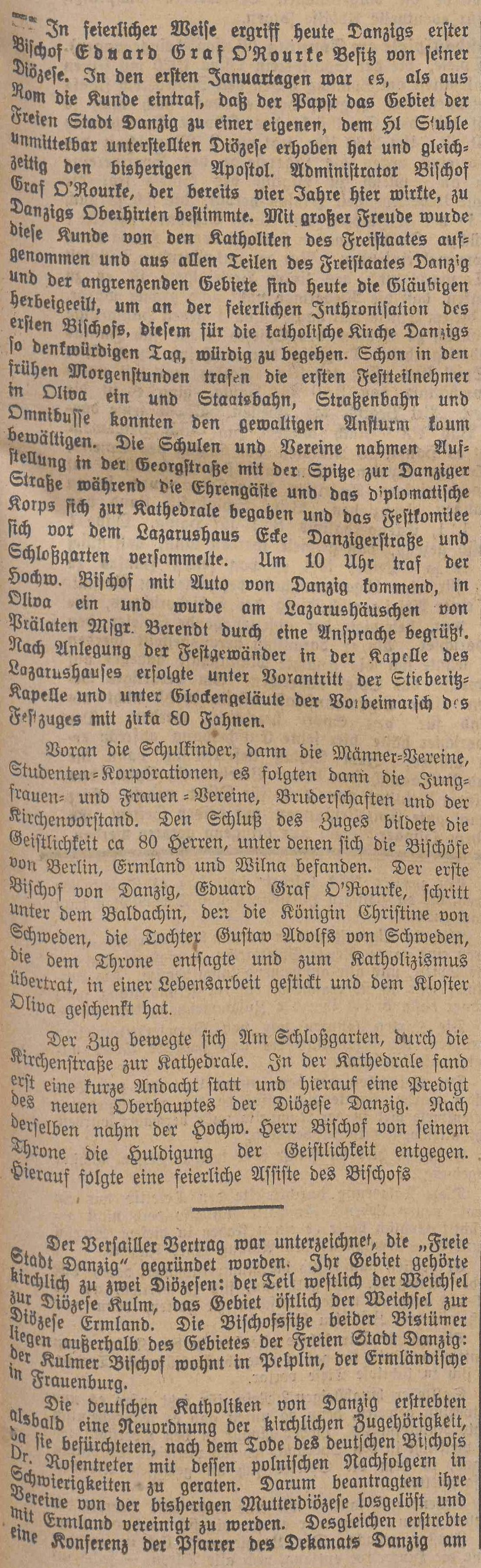 Podczas uroczystej ceremonii, która odbyła się dziś, pierwszy biskup Gdańska, hrabia Eduard O'Rourke, objął diecezję. W pierwszych dniach stycznia z Rzymu nadeszła wiadomość, że papież podniósł terytorium Wolnego Miasta Gdańska do rangi odrębnej diecezji, bezpośrednio podległej Stolicy Apostolskiej, a jednocześnie mianował poprzedniego administratora apostolskiego, biskupa hrabiego O'Rourke, który pełnił tam już czteroletnią posługę, pasterzem Gdańska. Wiadomość ta została przyjęta z wielką radością przez katolików Wolnego Państwa, a wierni ze wszystkich stron Wolnego Państwa Gdańska i okolic zgromadzili się dziś w Gdańsku, aby uczcić uroczystą intronizację pierwszego biskupa – dzień tak pamiętny dla gdańskiego Kościoła katolickiego. Pierwsi uczestnicy przybyli do Oliwy wczesnym rankiem, a kolej państwowa, tramwaje i autobusy były w stanie poradzić sobie z ogromnym napływem wiernych. Szkoły i kluby zgromadziły się na Georgstraße, z czołem procesji zwróconym w stronę Danziger Straße, podczas gdy dostojni goście i korpus dyplomatyczny udali się do katedry, a komitet uroczystości zebrał się przed Domem Łazarza na rogu Danziger Straße i ogrodów zamkowych. O godzinie 10:00 Najczcigodniejszy Biskup przyjechał do Oliwy samochodem z Gdańska i został powitany w Domu Łazarza przez prałata Migra Berendta przemówieniem. Po nałożeniu odświętnych szat liturgicznych w kaplicy Domu Łazarza, procesja, prowadzona przez Orkiestrę Stieberitów i przy dźwiękach dzwonów, przemaszerowała z około 80 flagami.