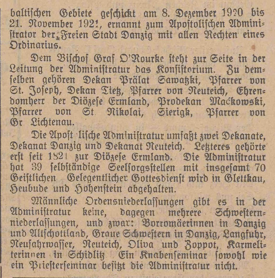 Dem Bischof Graf O'Rourke steht zur Seite in der Leitung der Administratur das Konsistorium. Zu demselben gehören Dekan Prälat Sawazki, Pfarrer von St. Joseph, Dekan Tiez, Pfarrer von Neuteich, Ehrendomherr der Diözese Ermland, Prodekan Mackowski, Pfarrer von St. Nikolai, Sierigk, Pfarrer von Gr. Lichtenau.