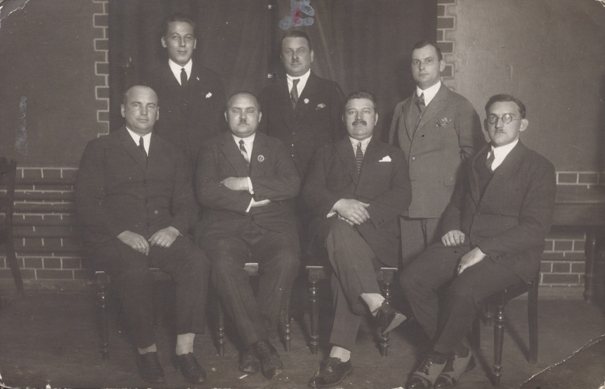 Zarząd Związku Kół Śpiewaczych V Okręgu Pomorskiego. Od lewej: bibliotekarz Jachemczak, wiceprezes Grimsman, prezes Leszczyński Stanisław, muzyk Feliks, stoją u góry: Tredkowski Maksym dygent, Komorski Jan zastępca drygęta, Mamel Władysław. Zbiory TPG Strefa Historyczna WMG.