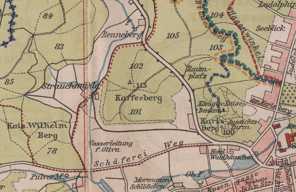 1. "Blick am " - widok z pod góry kawowej na Renneberg (Rynarzewo). W głębi ul. Köllner Chaussee (Spacerowa).