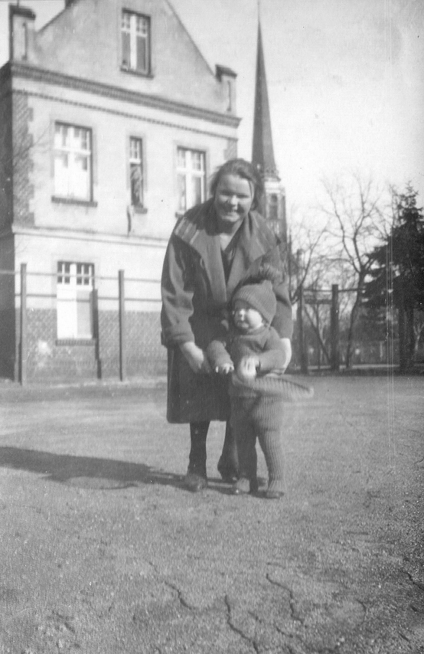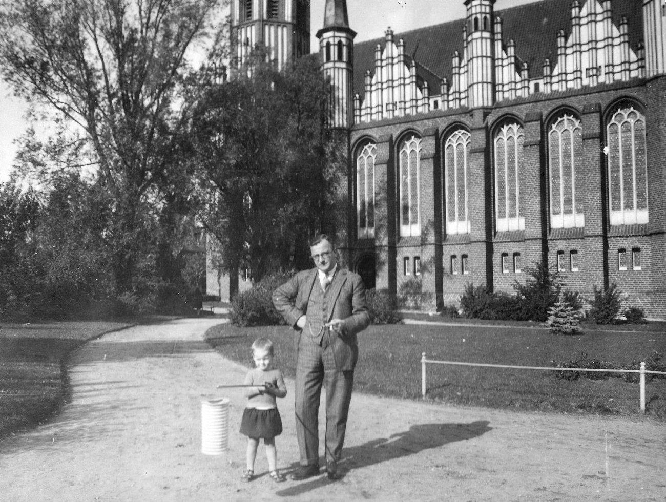 5. Otto Grimmer z synem na placu przy ewangelickim kościele "Versöhnungskirche" (Pojednania - obecnie Kościół Matki Bożej Królowej Korony Polskiej oo. Cystersów w Oliwie) przy ul. Waldstraße 5-6 (Leśna). Fasada południowa.