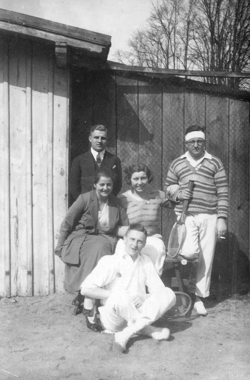 3. Otto Grimmer (po prawej) ze znajomymi przed budynkiem gospodarczym kotów tenisowych rzy ul. Jahnstraße 24-25 (Alfa Liczmańskiego 24-25).