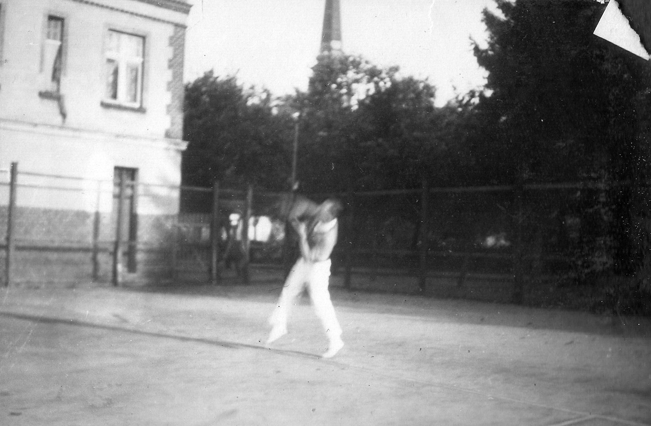 2. Joop Grimmer (po lewej) przed budynkiem gospodarczym kotów tenisowych rzy ul. Jahnstraße 24-25 (Alfa Liczmańskiego 24-25).
