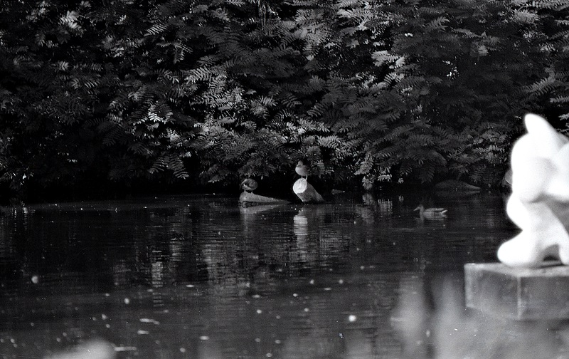 Fragment stawu "łabędzi" znajdujący się w północnej tzw. "Angielskiej" części parku oliwskiego przed wodospadem. Do około 1600 roku był zbiornikiem zasilającym wytwórnię drutu (młyn). Po prawej fragment pływającej rzeźby. Fot. z 1975 roku.