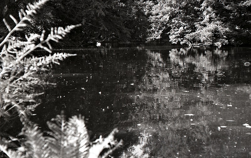 Fragment stawu "łabędzi" znajdującego się w północnej tzw. "Angielskiej" części parku oliwskiego przed wodospadem. Do około 1600 roku był zbiornikiem zasilającym wytwórnię drutu (młyn poruszany siłą potoku oliwskiego). Fotografię wykonano z 1975 roku.