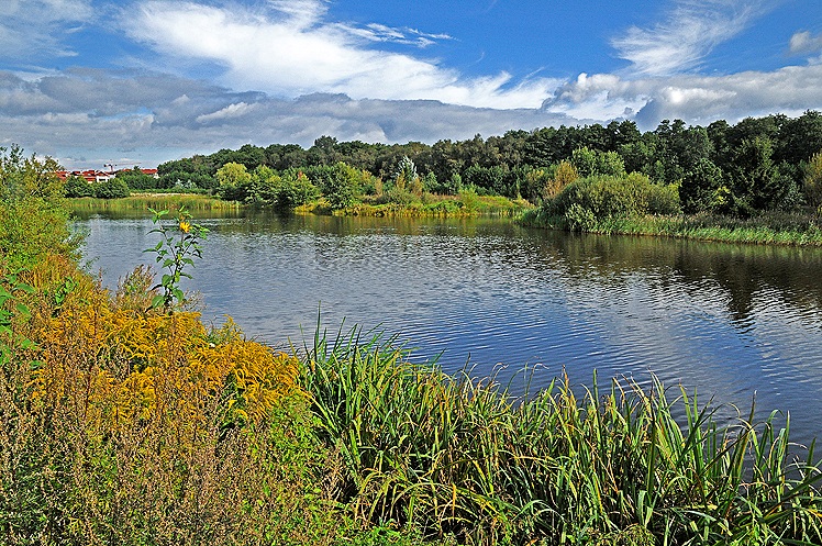 Największe jeziorko w Parku Ronalda Reagana z kwitnącą nawłocią w lewym rogu zdjęcia. Tak piękne chmury były 02 września 2012 roku.