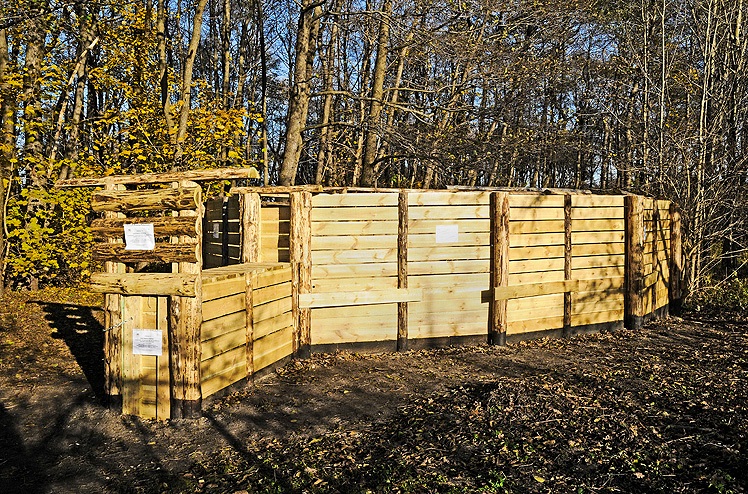 Dużym problemem w Parku im. Ronalda Reagana są szkody wyrządzone przez dziki. Jest ich tu sporo, a rezultatem ich bytności są zryte kwietniki, alejki, murawa. Podjęto decyzję o wyłapaniu dzików i przesiedlenie ich w dalekie stąd miejsce. Zbudowano specjalną odłownię, która sprawdzała się na innych terenach. Na zdjęciu, które wykonałem 19 listopada 2012 roku, widoczna jest odłownia dzików w parkowym ustroniu. Z lewej strony widocznej odłowni, złapany w pułapce dzik będzie zmuszony do wejścia do specjalnej klatki, w której zostanie przetransportowany w inne miejsce.