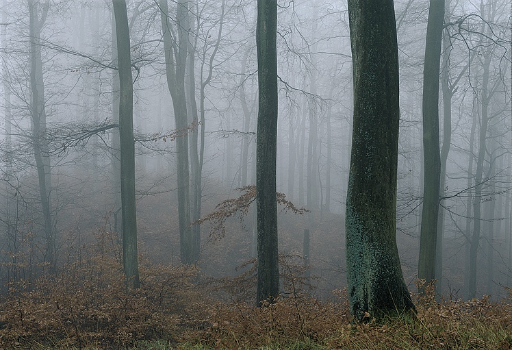 Mgła sprawia, że las staje się bajkowo tajemniczy. Ten fragment bukowego lasu, rosnącego w pobliżu pomnika przyrody "Głaz w Wykopie", sfotografowałem w 1998 roku.