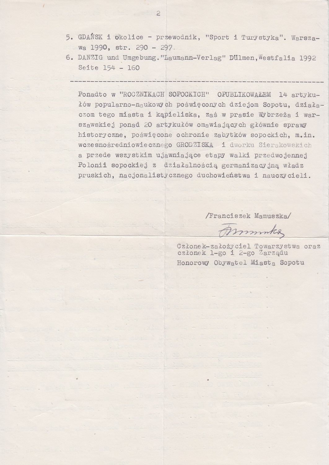 Franciszek Mamuszka › Opracowania: 01. Wybrzeże Gdańskie, kąpieliska i miasta przymorza gdańskiego, Warszawa 1948 02. Pobrzeże Gdańskie, wyd. I, Warszawa 1951 03. Pobrzeże Gdańskie, wyd. II, Warszawa 1953 04. Malbork i okolice, wyd. I, Warszawa 1954 05. Malbork i okolice, wyd. II, Warszawa 1954 06. Frombork - Gród Kopernika, Warszawa 1954 07. Malbork i zamek malborski, Gdynia 1957 08. Województwo gdańskie, wyd. I, Warszawa 1959 09. Gniew i okolice, Warszawa 1962 10. Królewska Droga w Gdańsku, Warszawa 1963 11. Województwo gdańskie, wyd. II, Warszawa 1963 12. Malbork i powiat malborski, Warszawa 1964 13. Budowle obronne ziemi gdańskiej, Gdańsk 1966 14. Zabytkowe budowle drewniane w województwie gdańskim, Gdańsk 1966 15. Gdańsk i ziemia gdańska, Warszawa 1966 16. Wejherowo i ziemia wejherowska, Gdańsk 1969 17. Droga Królewska w Gdańsku, Kraków 1972 18. Sopot szkic z dziejów, Wrocław-Gdańsk, Ossolineum 1975 19. Elbląg i okolice, Gdańsk 1978 20. Kaszubi oliwscy. Szkice z dziejów Polonii oliwskiej w latach od około 1850 do 1945, Gdańsk 1980 21. Bedeker Sopocki, Wydawnictwo Morskie, Gdańsk 1981 22. Malbork i okolice, Bydgoszcz 1981 23. Sopot. Rys dziejów, TPS, Sopot 1983 24. Pomorze Gdańskie, Warszawa 1983 25. Trójmiasto. Gdańsk-Sopot-Gdynia, Gdańsk 1984 26. Oliwa. Okruchy z dziejów, zabytki, Gdańsk 1985 27. Sztum i ziemia sztumska, Gdańsk 1985 28. Port gdański, Warszawa 1988 29. Westerplatte, Warszawa 1988 30. Ziemia pucka, Warszawa 1989 31. Sopot i okolice przewodnik, "Sport i Turystyka", Warszawa 1989 32. Gdańsk i okolice, Warszawa 1990 33. Kronika życia polskiego w Sopocie na przestrzeni wieków, Wydawnictwo Pomorskie PTTK, Gdańsk 1990Wsółautor: A. Bukowski, Stanisław Szymamński, Pojezierze Kaszubskie, Warszawa 1952 M. Pelczar, S. Szymborski, Elbląg i okolice, Warszawa 1952 Leon Mroczkiewicz, Oliwa, wyd. II, Warszawa 1953 PTTK Trójmiasto, Informator turystyczny woj. gdanskiego, Gdańsk 1956 Słownik geografii turystycznej Polski, Warszawa 1956 Maciej Kilarski, Jerzy Stankiewicz, Oliwa (wykaz zabytków wg stanu z grudnia 1956 r.), Gdańsk 1957 Jerzy Stankiewicz, Oliwa. Dzieje i zabytki, Gdańsk 1959 Jerzy Stankiewicz, Zabytki powiatu słupskiego, Poznań 1962 Praca zbiorowa, Miasta polskie w tysiącleciu, tom I, Wrocław 1965 Janusz Wąsowicz, Zeszyt Muzeum Pomorskiego, Gdańsk 1968 Izabela Trojanowska, W krainie kaszubskich jezior, Gdynia 1968 Praca zbiorowa pod redakcją Franciszka Mauszki. Gdańsk. Jego dzieje i kultura, Warszawa 1969 Izabela Trojanowska, Kościerzyna i ziemia kościerska, Gdańsk 1972 Przewodnik po Polsce, Warszawa 1976 Eugeniusz Andrzejewski, Jerzy Szukalski, Województwo gdańskie, Gdańsk 1982Artykuły: Dokąd udać się na... Sobieszewo, Dziennik Bałtycki 24. 6. 1951 Dokąd udać się na... Sztutowo, Dziennik Bałtycki 30. 6. 1951 Dokąd udać się na... Żeliszewo-Osłonino-Rzucewo-Puck, Dziennik Bałtycki 5. 7. 1951 Dokąd udać się na... Chmielno, Dziennik Bałtycki 28. 7. 1951 Dokąd udać się na... Wieś spółdzielcza Kulice, Dziennik Bałtycki 7. 8. 1951 Rzadki zabytek budownictwa, Dziennik Bałtycki 23-26. 12. 1956 Ongiś w Oliwie huczały młoty kuźnic, Turysta 15. 10. 1957 Wiatraki, Dziennik Bałtycki 05-06. 10. 1958 Przez dwa wieki biły tu młoty kiźni miedzi i żelaza, Kaszëbë 15. 11. 1958 Szpitalik oliwski, Dziennik Bałtycki 15-16. 02. 1959 Młyny prochowe, Dziennik Bałtycki 02-03. 08. 1959 Przytułek przy ul. Sierocej w Gdańsku, Dziennik Bałtycki 11-12. 10. 1959 Gotyckie baszty na Starym Przedmieściu, Dziennik Bałtycki 14-15. 08. 1960 Mur z ulicy Krowoderskiej, Dziennik Bałtycki 09. 10. 1960 Kwidzyn - Jego dzieje i zabytki, Jantarowe Szlaki, Nr 10-11, 1961 Pierwsze lata PTK, Jantarowe Szlaki, Nr 3-4 1971 Polonia sopocka 1918-1939, Litery, 05-1972 Przypominam bohaterskich dziennikarzy w 35 rocznicę ich męczeńskiej śmierci, Dziennik Bałtycki 11-12. 01. 1975 Społeczność kaszubska Oliwy w II połowie XIX wieku, Pomerania nr 2 (73) 1977Fotografie: Władysław Wzorek, Rozewie, Warszawa 1962 Izabela Trojanowska, Wdzydze, Warszawa 1963Na stronie DawnaOliwa.pl: "PTTK" (Dziennik Bałtycki, 1946) Przewodnik: "Oliwa" (Dziennik Bałtycki, 1954) Franciszek Mamuszka - Przybyłem aby zostać (Jerzy Samp, Pomerania 4-1976) Franciszek Mamuszka (Jerzy Stankiewicz, Spotkania z zabytkami 4-1983, Natalia Gromow 2005) Recenzja: "Oliwa. Okruchy z dziejów, zabytki" (Pomerania, 4-1986) Franciszek Mamuszka - Życie dobrze polskie (Dziennik Bałtycki, 1995) Franciszek Mamuszka - Nestor pomorskiego krajoznawstwa (Jantarowe szlaki, 2-1995) Zobacz: Franciszek Mamuszka, Wikipedia Franciszek Mamuszka, Gedanopedia Franciszek Mmauszka, iBedeker Patroni tramwajów: Franciszek Mamuszka, Trojmiasto.pl, 2017
