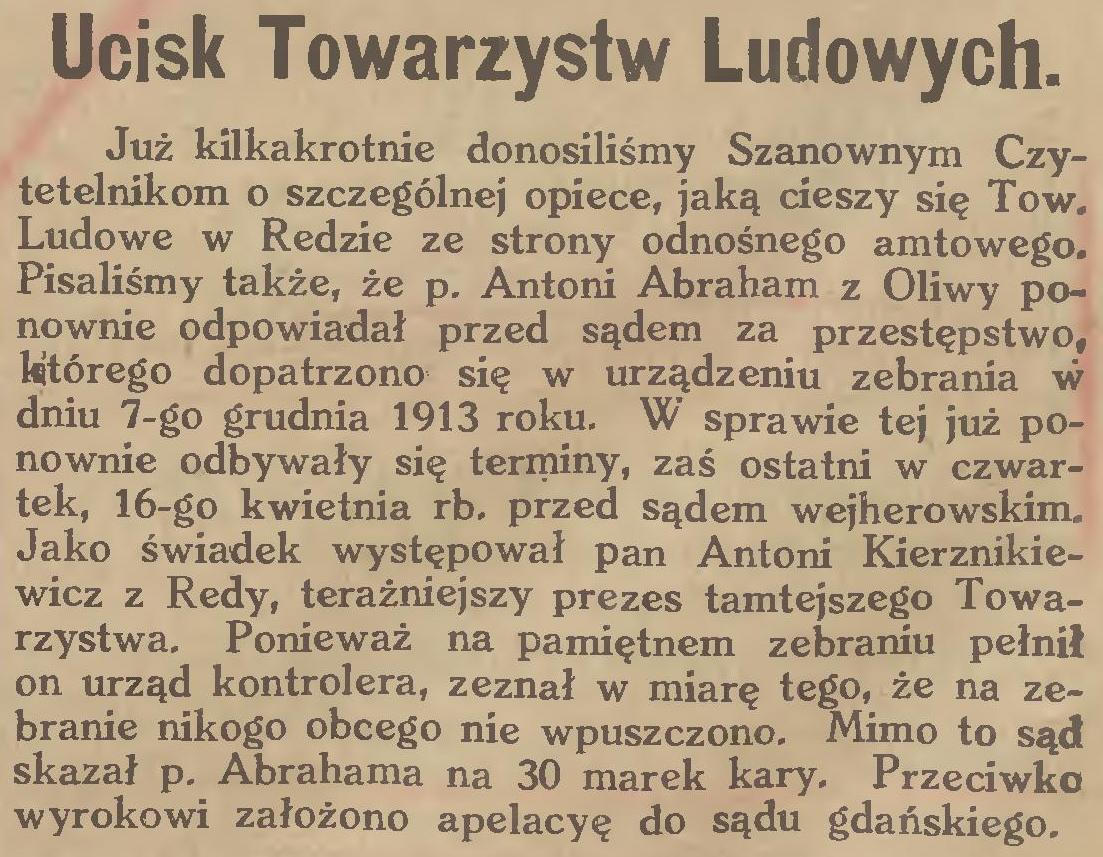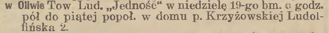 1909 - Oliwa. Przyszłe zebranie "Jedności" odbędzie się w przyszłą niedzielę dnia 24. b. m. o 4 godz. na sali pana Thierfelda (al. Grunwaldzka 534 - spalony pod koniec marca 1945 roku). ![]() Gazeta Gdańska nr 9 z 21. 1. 1909 r. Zbiory Pomorskiej Biblioteki Cyfrowej. - Oliwa. Baczność! Towarzystwo "Jedność" urządza tu w niedzielę na sali Thierfelda (al. Grunwaldzka 534) teatr amatorski. Odegrają go amatorzy z Gdańska, a odegrają dwie śliczne sztuki: "Nowy rok", który wystawiono na rocznicy gdańskiej "Jedności" i jedną część "Trójki hultajskiej". Obie są tak wesołe, że nawet największy mruk musi niemowoli się śmiać. Niech tam w Oliwie każdy zatem agituje, ażeby sala była pełna, co i kasa się wzmocni, i dla duszy polskiej tem większy będzie pożytek. ![]() Gazeta Gdańska nr 11 z 26. 1. 1909 r. Zbiory Pomorskiej Biblioteki Cyfrowej. Wiece i zebrania odbędą się: W Oliwie "Jedność" w niedzielę 28. bm. o 4. godz. w hotelu p. Thierfelda (al. Grunwaldzka 534). Na porządku dziennym wykład o Kościuszce. ![]() Gazeta Gdańska nr 24 z 25. 2. 1909 r. Zbiory Pomorskiej Biblioteki Cyfrowej. - Oliwa. Ubiegłej niedzieli odbyło się na sali p. Thierfelda (al. Grunwaldzka 534) przy licznym udziale członków walne zebranie Towarzystwa "Jedność", któremu przewodniczył p. Antoni Abraham ze Sopot. Do nowego zarządu wstąpili pp. Dempc jako prezes, Preiss zastępca, Krefta sekretarz, Tempski zastępca, Trepczyk skarbnik, Müller zastępca, Bednarek bibliotekarz, Mateja zastępca. Na Ławników powołano pp.: Jana Bednarka i Stefanowskiego, do chorągwi dwóch braci Dempców i p. Trepczyk. Pan Abraham miał mały wykład, Franciszek Tempski wygłosił odczyt. Kto pragnie nabyć tabakierki "Drzymałki" niech się zgłosi do p. Abrahama, Sopot, Elisabethstr. 16. ![]() Gazeta Gdańska nr 33 z 18. 3. 1909 r. Zbiory Pomorskiej Biblioteki Cyfrowej. Wiece i zebrania odbędą się: W Oliwie Tow. "Jedność" w niedz. 16 b. m. na sali hotelu Thierfelda (al. Grunwaldzka 534) o 4 godz. po obiedzie. ![]() Gazeta Gdańska nr 57 z 13. 5. 1909 r. Zbiory Pomorskiej Biblioteki Cyfrowej. Wiece i zebrania odbędą się: W Oliwie Towarzystwo Jedność 11 bm. zwykłe zebranie o 4 godz. po połud. w hotelu p. Thierfelda (al. Grunwaldzka 534). ![]() Gazeta Gdańska nr 80 z 6. 7. 1909 r. Zbiory Pomorskiej Biblioteki Cyfrowej. Wiece i zebrania odbędą się: W Oliwie Towarzystwo Jedność 11 bm. zwykłe zebranie o 4 godz. po połud. w hotelu p. Thierfelda (al. Grunwaldzka 534). ![]() Gazeta Gdańska nr 81 z 8. 7. 1909 r. Zbiory Pomorskiej Biblioteki Cyfrowej. Wiece i zebrania odbędą się: W Oliwie Towarzystwo Jedność 11 bm. zwykłe zebranie o 4 godz. po połud. w hotelu p. Thierfelda (al. Grunwaldzka 534). ![]() Gazeta Gdańska nr 82 z 10. 7. 1909 r. Zbiory Pomorskiej Biblioteki Cyfrowej. Śp. Józef Rutowski w Oliwie rozpoczął swoje wielkie dzieło w czasie walki kulturnej bez opieki karczmarzy. Pomimo to zapisało się pod jego sztandar na jednem miejscu 1600 osób, na drugiem 62 osoby. Mam tu na myśli stworzoną przez niego kasę pogrzebową i towarzystwo "Jedność". ![]() Gazeta Gdańska nr 100 z 21. 8. 1909 r. Zbiory Pomorskiej Biblioteki Cyfrowej. Wiece i zebrania odbędą się: W Oliwie Tow. Ludowe Jedność 29 sierpnia w hot. Thierfelda (al. Grunwaldzka 534) o godz. 4 po poł. ![]() Gazeta Gdańska nr 101 z 24. 8. 1909 r. Zbiory Pomorskiej Biblioteki Cyfrowej. Wiece i zebrania odbędą się: W Oliwie Towarzystwo "Jedność" d. 12 bm. o g. 4 i pół w lokalu Thierfelda (al. Grunwaldzka 534). ![]() Gazeta Gdańska nr 109 z 11. 9. 1909 r. Zbiory Pomorskiej Biblioteki Cyfrowej. - Skarszewy. W pewnej okolicznej wiosce przedstawił się innowierca, podróżujący na maszyny do szycia, jako dobry katolik, byle interes zrobić. Wyrażał zdziwienie, że ludzie mają tak mało obrazów na ścianach, i wychwalał się, że on ich ma więcej. W Przodkowie przedkładał znowu różaniec, na rzekomy dowód, jaki on to pobożny. Tymczasem jest to luter, który na bałamucenie ludzi wychodzi. Kto pragnie dobrą maszynę Singera nabyć, temu polecamy gorliwego wiarusa w osobie p. Antoniego Abrahama ze Sopotu, który przeniósł się teraz do Oliwy, Pelonkenstr. num. 4 (ul. Polanki 3). Jeżeli ktoś z jego odbiorców ma jaki błąd przy maszynie, może każdego czasu się zgłosić do p. Abrahama, który natychmiast postara się o naprawę. ![]() Gazeta Gdańska nr 119 z 5. 10. 1909 r. Zbiory Pomorskiej Biblioteki Cyfrowej. Wiece i zebrania odbędą się: W Oliwie towarzystwo "Jedność" 10 bm. o 4 1/2 w hotelu Thierfelda (al. Grunwaldzka 534). ![]() Gazeta Gdańska nr 121 z 9. 10. 1909 r. Zbiory Pomorskiej Biblioteki Cyfrowej. Wiece i zebrania odbędą się: W Oliwie Jedność w niedzielę 24 bm. o godz. 4 1/2 po poł. w lokalu p. Thierfelda (al. Grunwaldzka 534). ![]() Gazeta Gdańska nr 127 z 23. 10. 1909 r. Zbiory Pomorskiej Biblioteki Cyfrowej. - Oliwa. Tutejsze Towarzystwo ludowe urządza w przyszłą niedzielę, dn. 7 listopada na sali hotelu Thierfelda Thierfelda (al. Grunwaldzka 534) przedstawienie amatorskie. Odegraną będzie sztuka "Dziesięć tysięcy marek". Początek koncertu o godz. 6, początek teatru o godz. 7 i pół. Po przedstawieniu zabawa z tańcami. Gości wolno tylko przez członków wprowadzać. Zarząd. ![]() Gazeta Gdańska nr 131 z 2. 11. 1909 r. Zbiory Pomorskiej Biblioteki Cyfrowej. 1913 Ruch w towarzystwach. Oliwa. Zebranie Tow. ludowego "Jedność" w Oliwie odbędzie się w niedzielę 16 bm. o godz. 4 po poł. w Chruszczanym Młynie (Strauchmühle) w lokalu p. Promy. ![]() Gazeta Gdańska nr 32 z 15. 3. 1913 r. Zbiory Pomorskiej Biblioteki Cyfrowej. 1914 Nowa kara za zebranie w Tow. Ludowym. Pan Antoni Abraham z Oliwy, znany działacz wśród swoich ziomków kaszubskich, był prezesem Tow, Lud. w Redzie, Znane są powszechnie prześladowania, które Towarzystwo rzeczone musiało przechodzić. Obecnie wezwal amtowy Block p. Abrahama, aby się wylegit