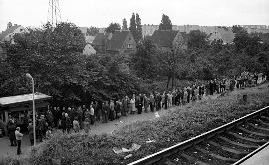 Kolejka po gazety przy peronie SKM Przymorze. Druga połowa sierpnia 1980 roku. © Fot. Krzysztof Jakubowski.