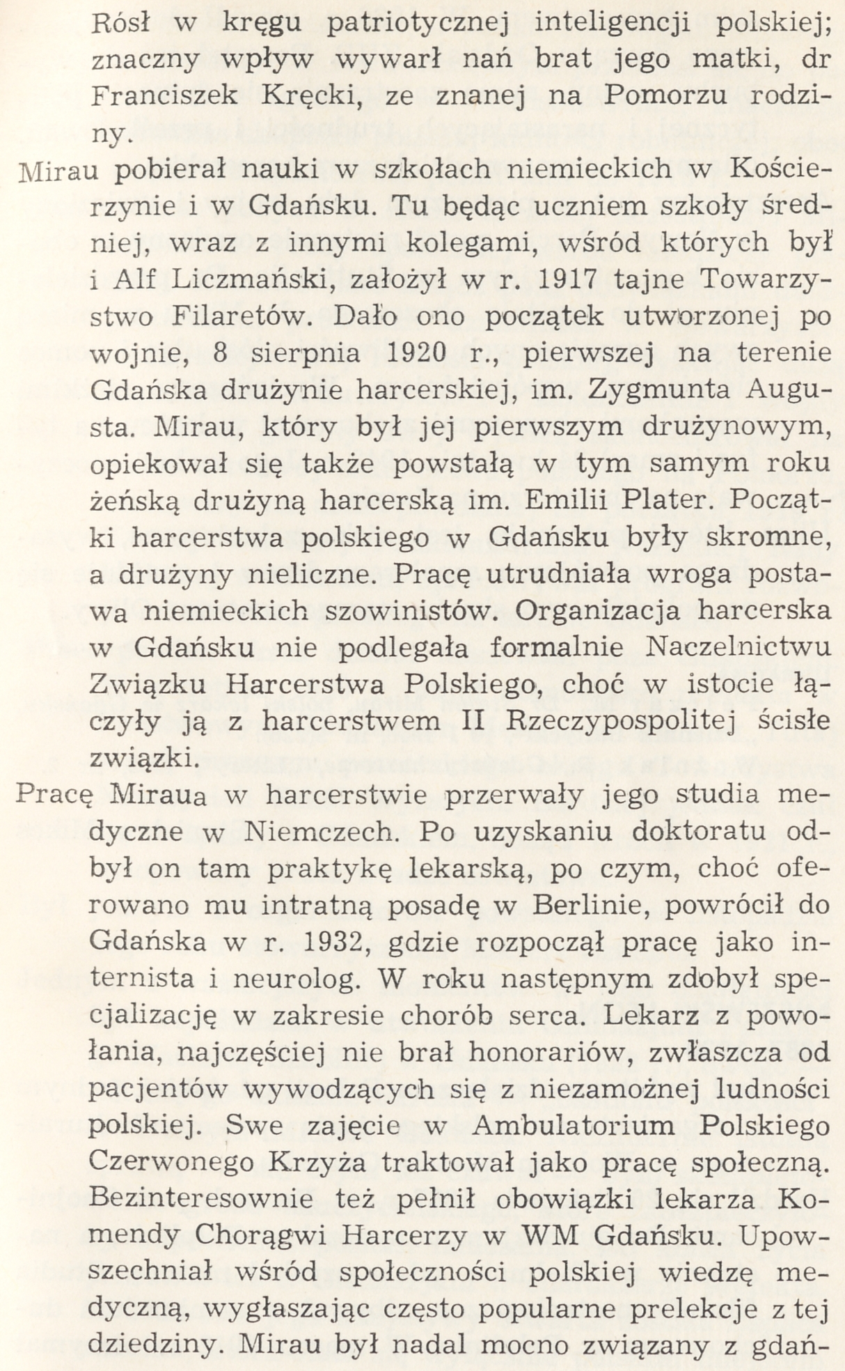 Pracę Miraua w harcerstwie przerwały jego studia medyczne w Niemczech. Po uzyskaniu doktoratu odbył on tam praktykę lekarską, po czym, choć oferowano mu intratną posadę w Berlinie, powrócił do Gdańska w r. 1932, gdzie rozpoczął pracę jako internista i neurolog. W roku następnym zdobył specjalizację w zakresie chorób serca. Lekarz z powołania, najczęściej nie brał honorariów, zwłaszcza od pacjentów wywodzących się z niezamożnej ludności polskiej. Swe zajęcie w Ambulatorium Polskiego Czerwonego Krzyża traktował jako pracę społeczną. Bezinteresownie też pełnił obowiązki lekarza Komendy Chorągwi Harcerzy w WM Gdańsku. Upowszechniał wśród społeczności polskiej wiedzę medyczną, wygłaszając często popularne prelekcje z tej dziedziny. Mirau był nadal mocno związany z gdańskim harcerstwem. W 1936 r. wszedł do miejscowego Zarządu Oddziału ZHP. Pozostał też do wybuchu wojny, mimo zaostrzenia się sytuacji politycznej i narastających trudności i prześladowań, ofiarnym i czynnym działaczem harcerskim.