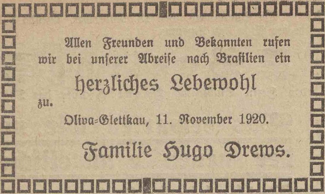 Hugo Drews. Olivaer Zeintung nr 266 z 12. 11. 1920 r.