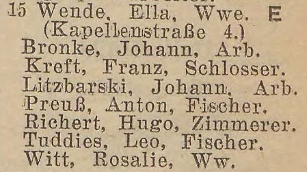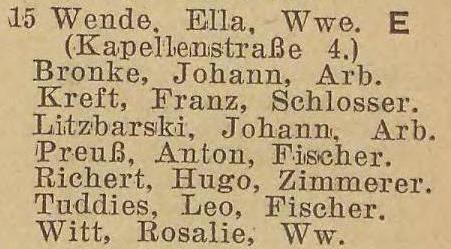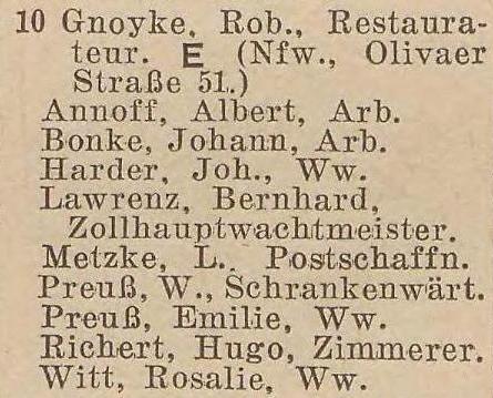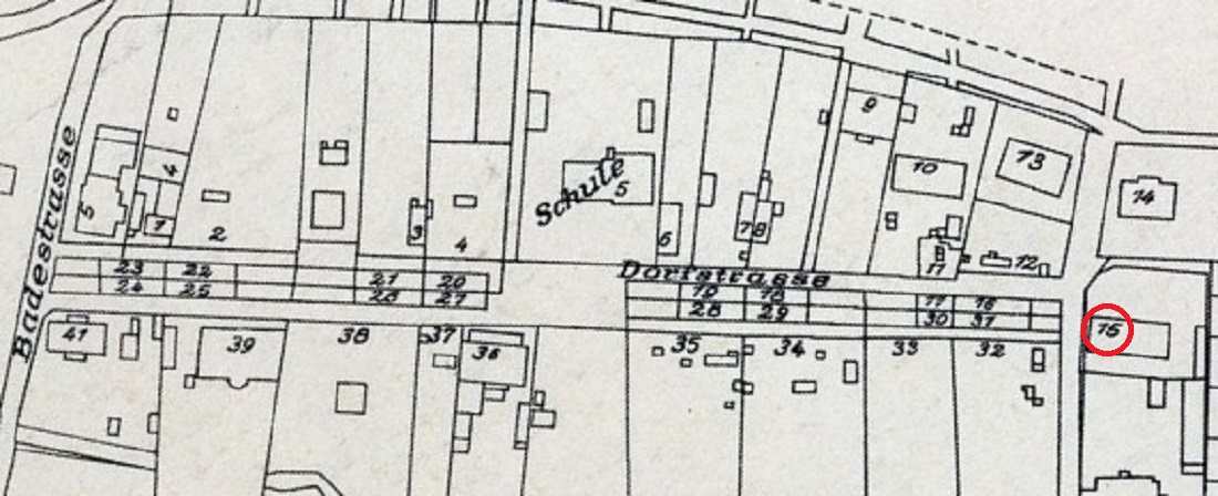 Glettkau 27 (1910) -› Gletkau 29 (1913-1914) -› Glettkau Dorfstraße 12 (1915-1916) -› Glettkau Dorfstraße 10 (1920-1921) -› Dorfstraße 10 (1925-1929) -› Dorfstraße 15 (1931-1942).