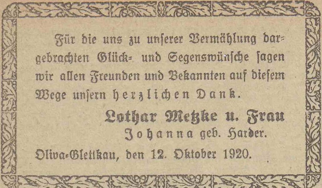 Lothar Metzke. Johanna Metzke z domu Harder. Olivaer Zeintung nr 240 z 13. 10. 1920 r.