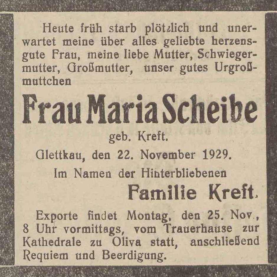 Maria Scheibe zd. Kreft. Olivaer Zeintung nr 275 z 23. 11. 1929 r.