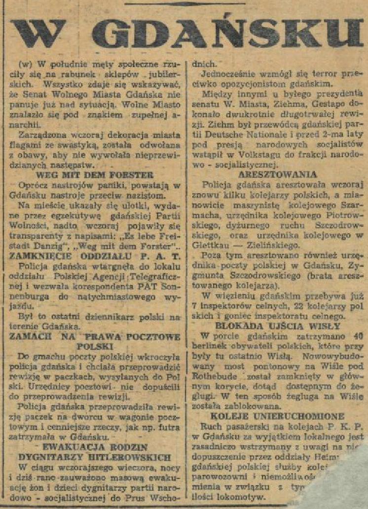 W Gdańsku. Aresztowania. Policja gdańska aresztowała wczoraj znowu kilku kolejarzy polskich... oraz urzędnika kolejowego w Glettkau - .