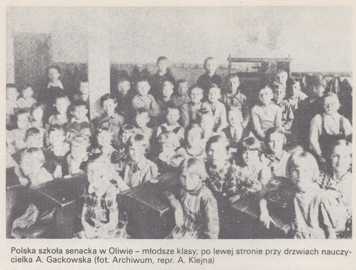 P o l s k a s z k o ł a w O l i w i e. Dużo troski przysparzała działaczom i ludności polskiej w Oliwie sprawa miejscowej szkoły. Starania o jej otwarcie, oliwska Rada Ludowa i Towarzystwo Ludowe "Jedność" rozpoczęły już w 1919 r., ale dopiero w kilka lał później, najprawdopodobniej w roku szkolnym 1922/23 w miejscowej niemieckiej Katolickiej Szkole, którą kierował rektor Johannes Riebandt, otwarto klasę z polskim językiem nauczania. Klasa ta mieściła się na poddaszu (spalonej w 1945 r. i następnie rozebranej) dobudówki do gotycko-barokowej budowli - niegdyś Szafami klasztornej, obecnie siedziby Kurii Biskupiej przy ul. Cystersów 15. Klasa obejmowała dzieci z kilku roczników, dochodzące tu z niemieckich klas na naukę przedmiotów udzielonych w języku polskim. Przez pewien czas, w latach mniej więcej 1928 - 1933, jedna polska klasa mieściła się w dzisiejszej Szkole Podstawowej nr 26, w dużej sali "balkonowej" na II piętrze. Wywołało to podobno oburzenie Niemców i dzieci polskie znalazły się znów na poddaszu, w tak zwanym "gołębniku". Wydaje się, że przysposobiono tam drugą salę dla polskiej szkoły senackiej i w tych dwu pomieszczeniach uczyły się dzieci polskie do 1939 r.
