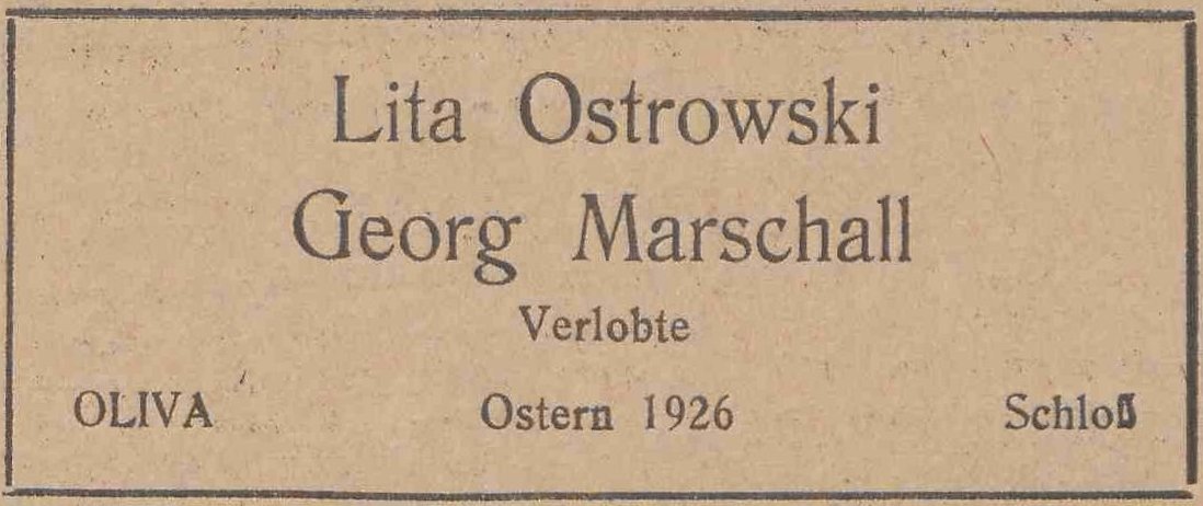 Lita Ostrowski (Schloß), Georg Marschall (Rothöfer Weg 4). Anzeiger mit der "Olivaer Zeitung", nr 79 z 06. 04. 1926.