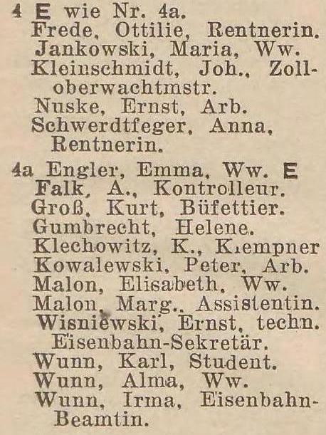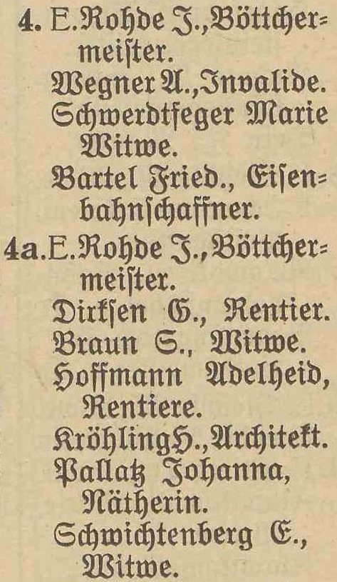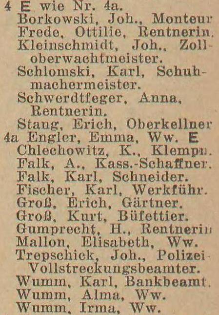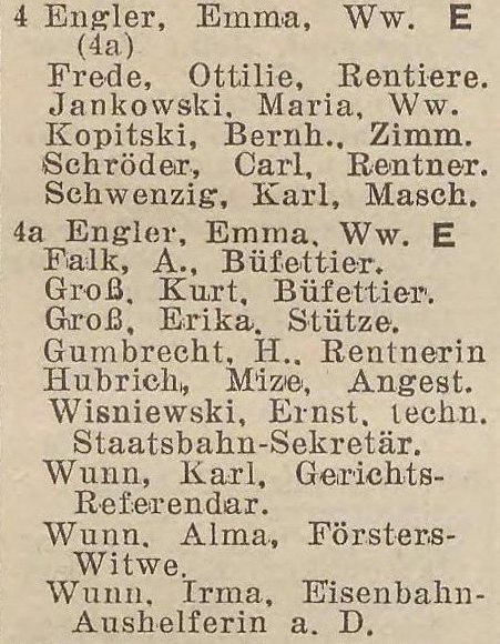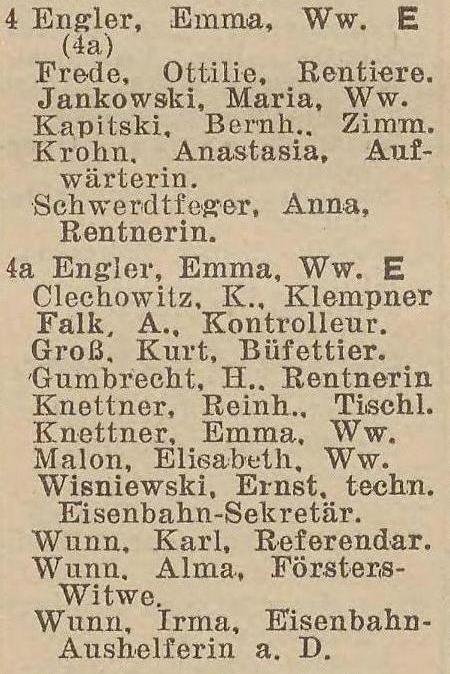 W (Ludolfiner Straße 4): Schwertfeger (6 osób), Krause (4 osoby), Wegner (4 osoby) oraz Bartel (3 osoby).