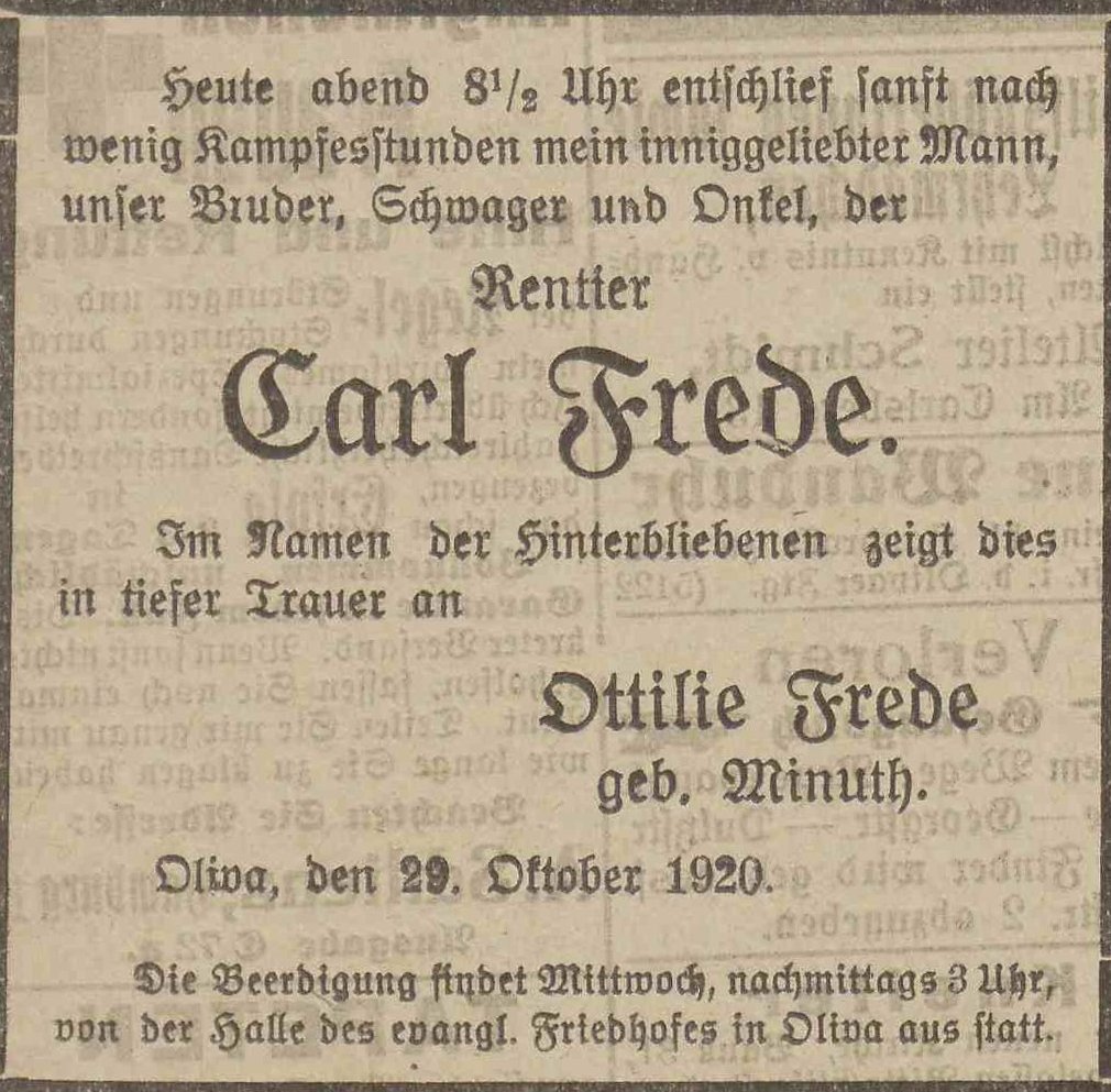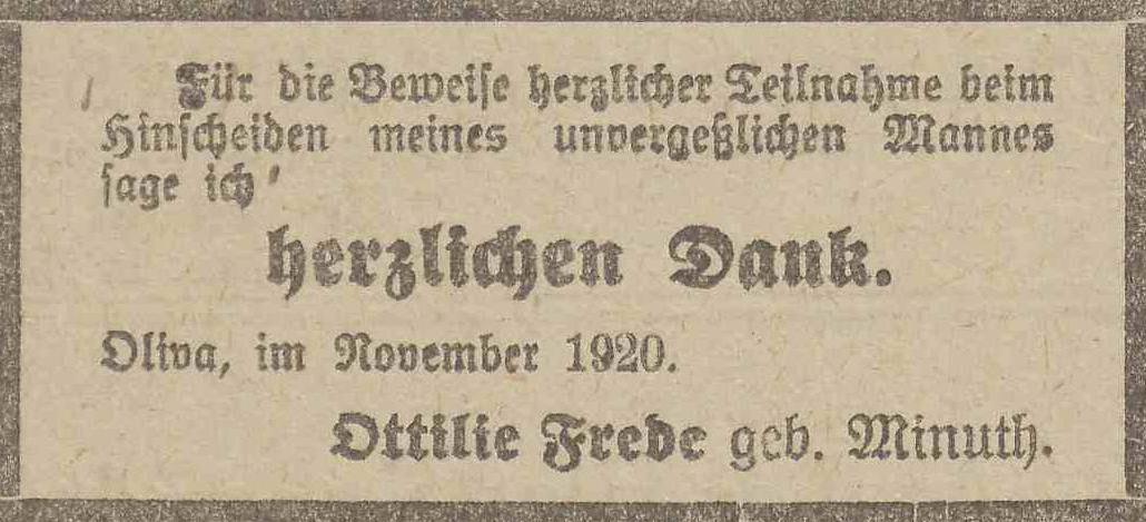 Carl Frede. Ottilie Frede z domu Minuth (1913-1935). Olivaer Zeintung nr 262 z 08. 11. 1920 r.