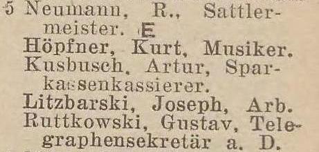 Artur Kusbuch (Kustuch), Joseph Litzbarski, Alfons Meironke, R. Neumann, Rohbeck, Gustav Ruttkowski, Anna Stefanowski, Trippenbach, Eugen Trzynski.