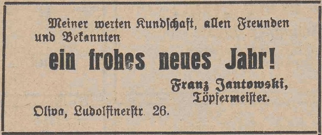 Frantz Jantowski. Podziękowania noworoczne, Danziger General (Olivaer Zeitung) nr 306 z 31. 12. 1926.