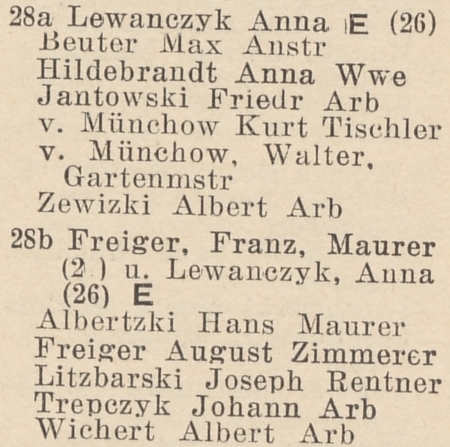 Franz Freiger. Anna Lewanzich. Książka adresowa gminy Oliwa z 1925 roku. Zbiory Pomorskiej Biblioteki Cyfrowej.