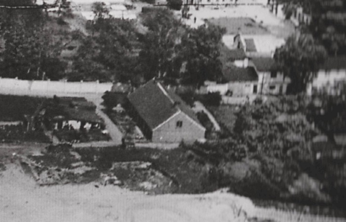 W centrum budynek nr 28b przy ul. Ludolfiner Straße (obecnie ul. Bobrowa nr 11). Widok z lotu ptaka. Lata 20/30 XX wieku. Herder Institut, Gdask na fotografii lotniczej z okresu międzywojennego, Wrocław 2010 rok.