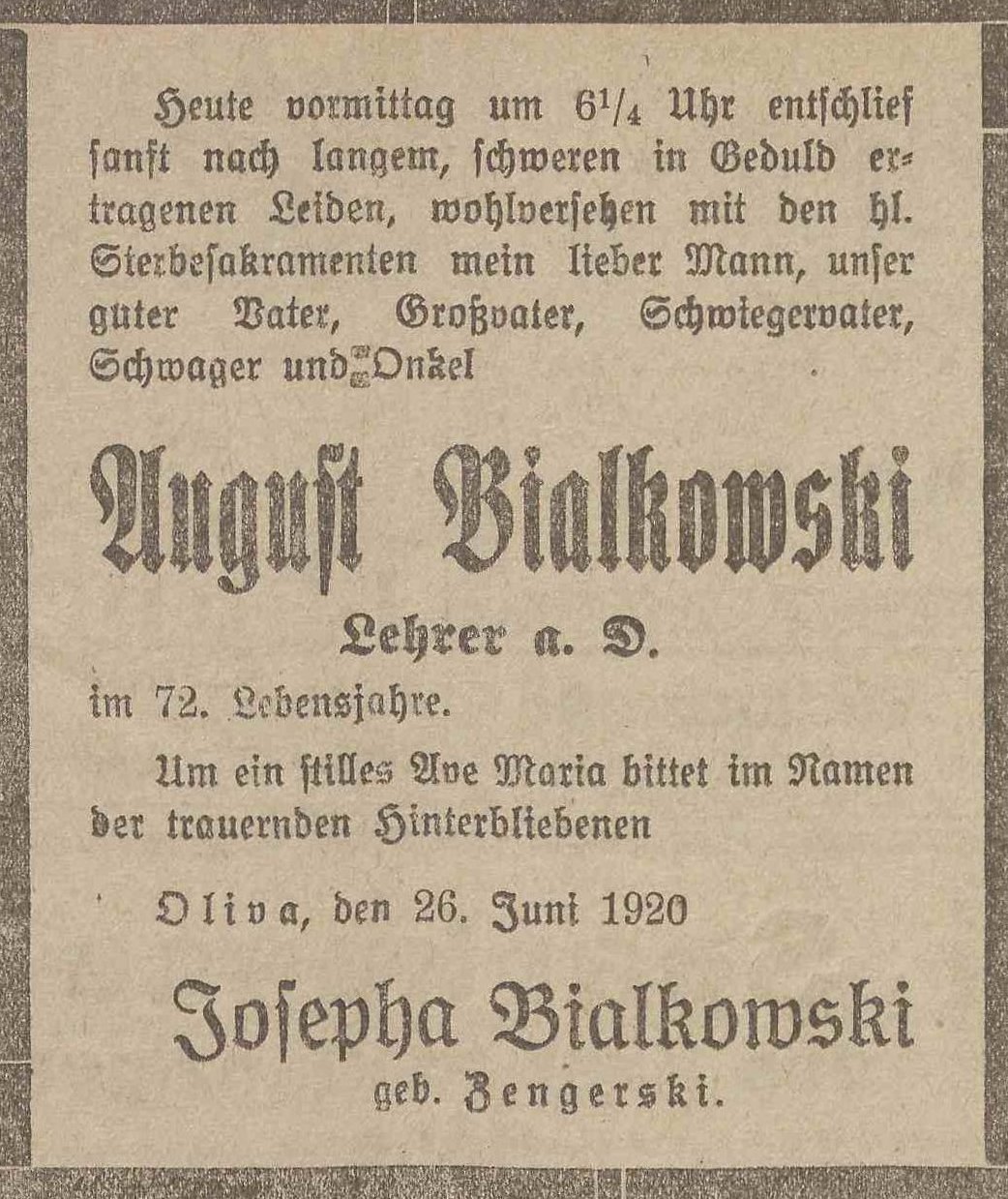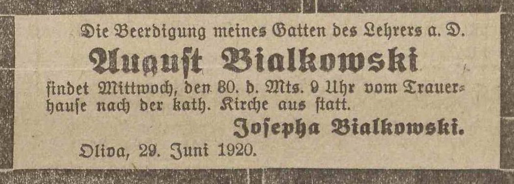 August Bialkowski. Josepha Bialkowski zd. Zengerski. Olivaer Zeintung nr 147 z 26. 06. 1920 r.