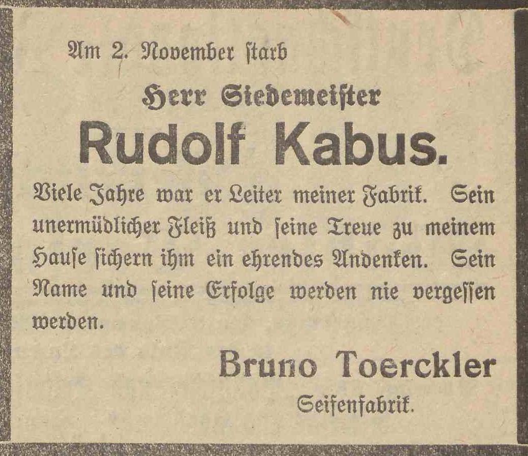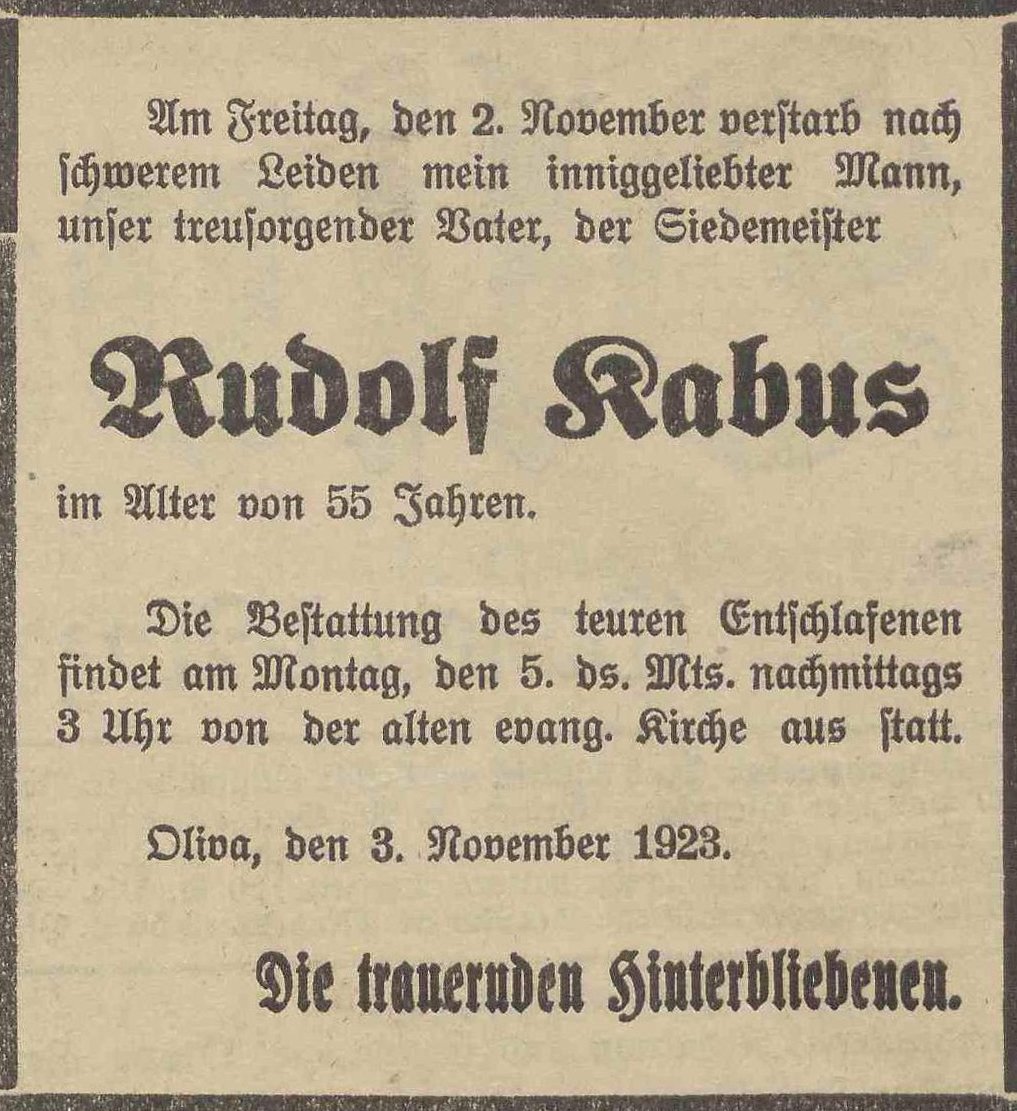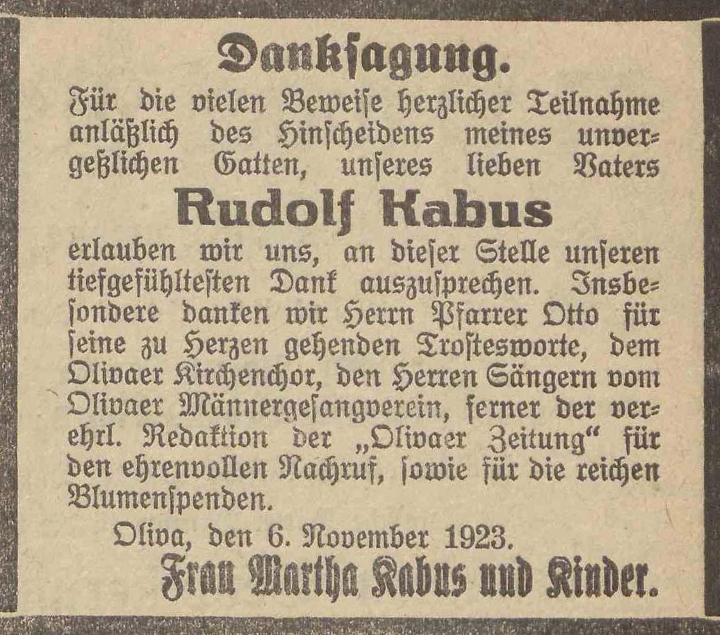 Rudolf Kabus. Olivaer Zeintung nr 257 z 03. 11. 1923 r.