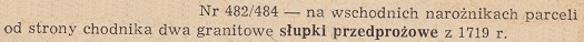 Nr 482/384 - na wschodnich narożnikach parceli od strony chodnika dwa granitowe słupli przedprożowe z 1719 r.