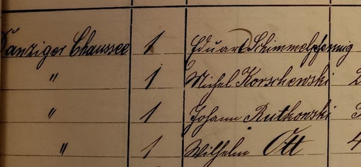 Danziger Chaussee 1: ... ..., ... Korschewski, Johannes Rutkowski, Wilhelm Ott. Spis z 1895 roku. Przekazała Grażyna Niemyjska.