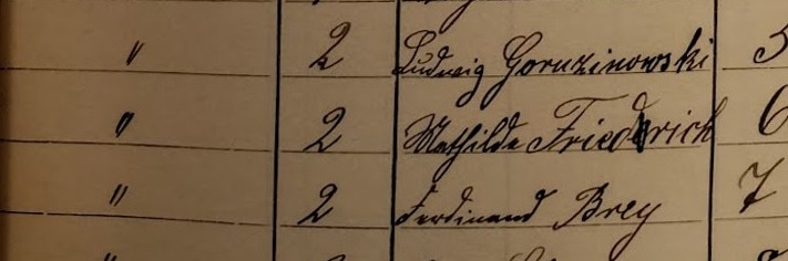 Danziger Chaussee 2: Ludwig Goruzinowski, Mathilde Friedrich, Ferdinand Brey. Spis z 1895 roku. Przekazała Grażyna Niemyjska.