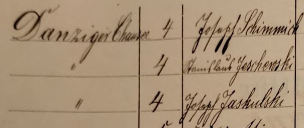 Danziger Chaussee 4: Joseph Schimmich, ... Jaschewski, Joseph Jaskulski, Franz Schelinski. Spis z 1895 roku. Przekazała Grażyna Niemyjska.