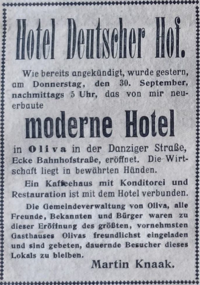 Hotel Deutscher Hof - otwarcie 30 września 1915. Olivaer Nachrichten z 1915 roku. Przekazała Grażyna Niemyjska.