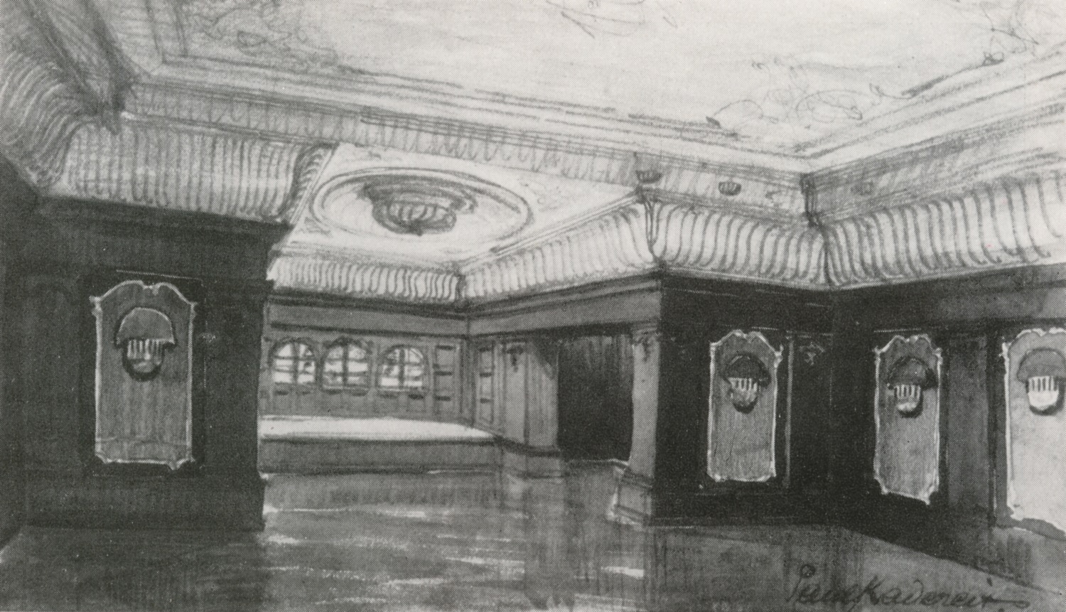 Wnętrze jednego z hoteli w Oliwie. Przypuszczalnie Deutscher Hof. Rysunek z prospektu architektonicznego (nie zapisano jakiego). Zbiory Krzysztofa Gryndera.