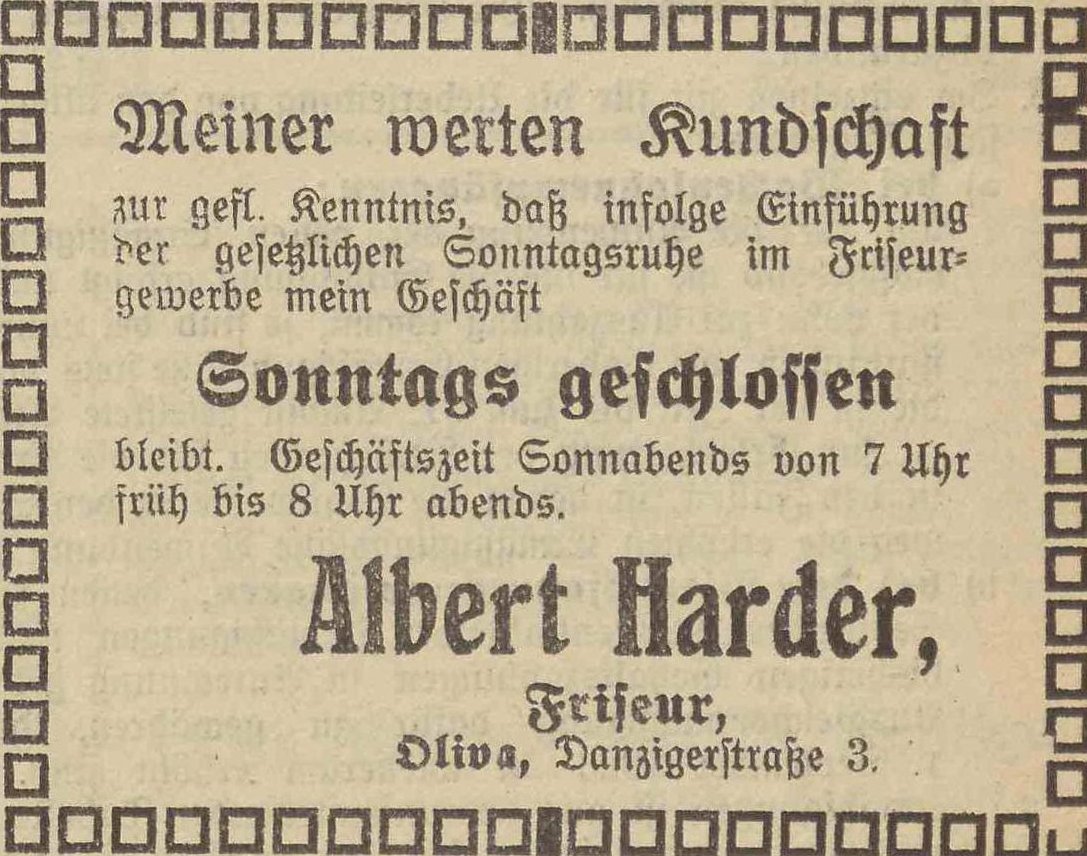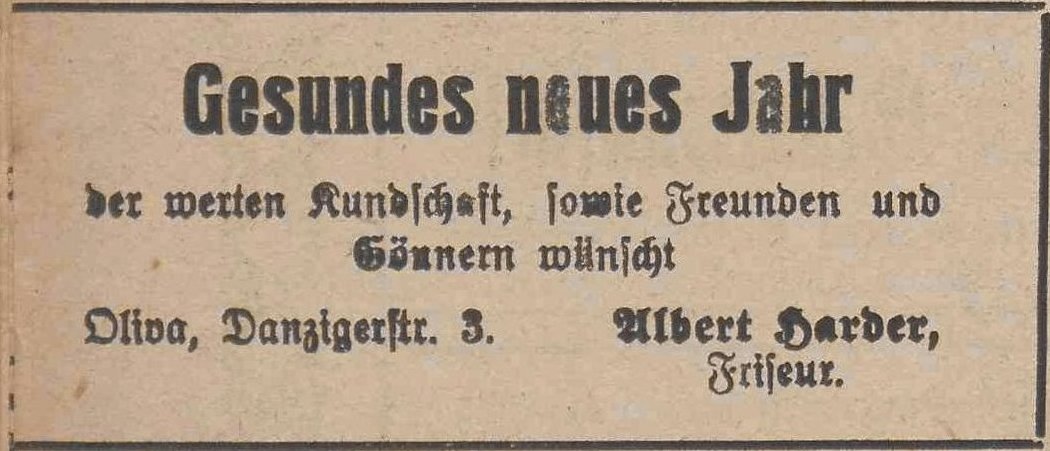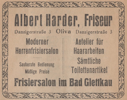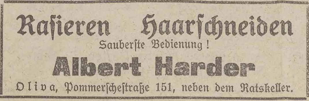 Albert Harder, fryzjer. Olivaer Zeintung nr 202 z 31. 08. 1923 r.