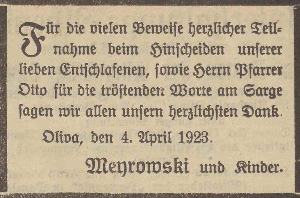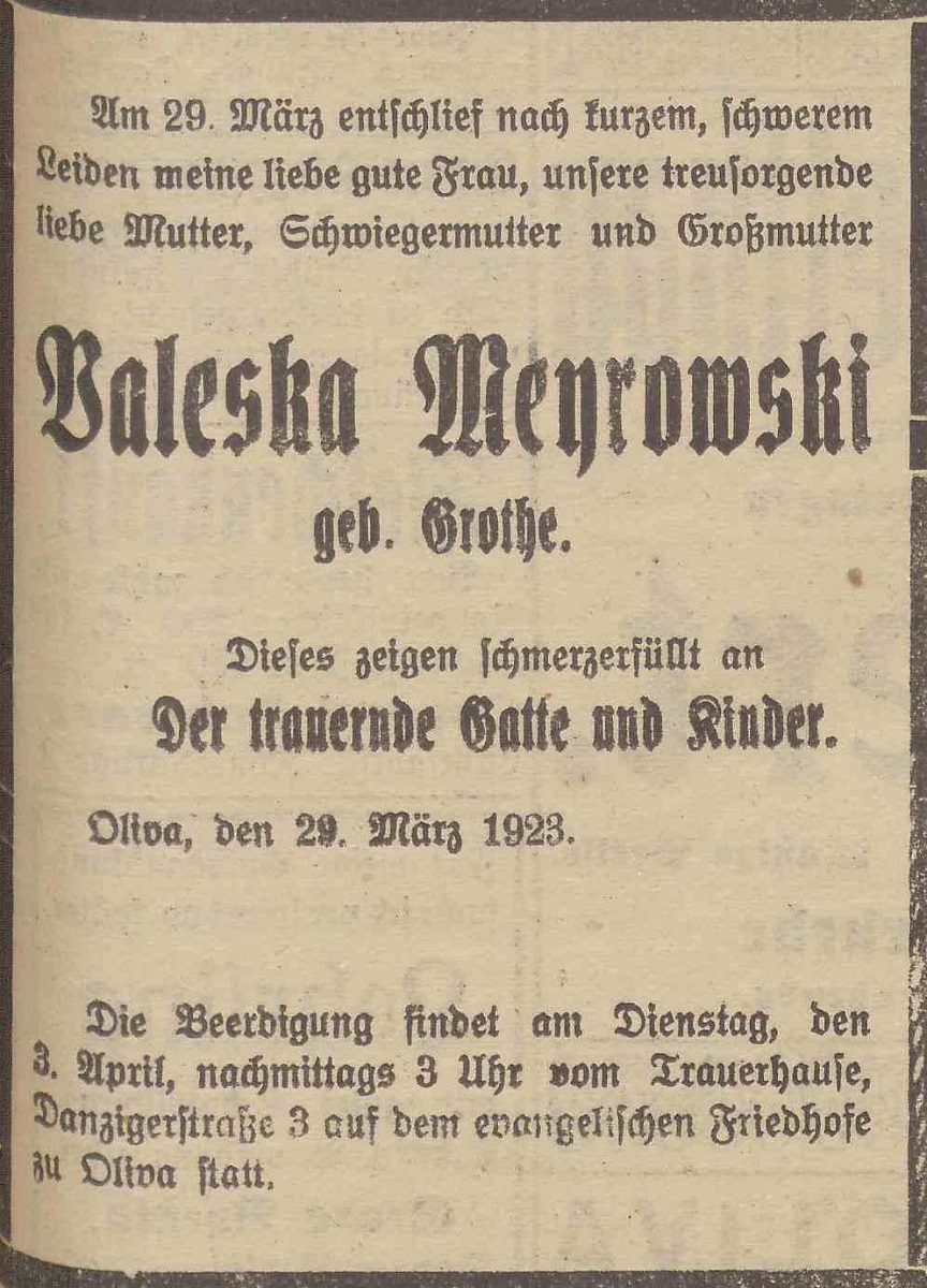 Valeska Meyrowski zd. Grothe. Olivaer Zeintung nr 76 z 31. 03. 1923 r.